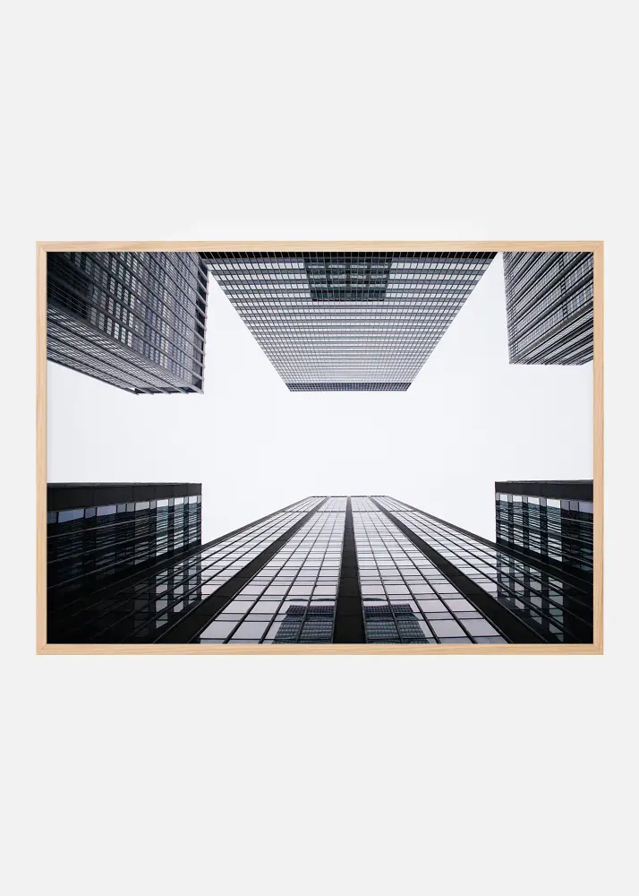 Posters d'architecture représentant des gratte-ciels en croissance contre un ciel nuageux blanc. Image épurée de bâtiments sombres sur un fond blanc, avec les reflets du ciel dans les vitres. Le cadeau parfait pour ceux qui aiment les portraits graphiques de bâtiments. L'impression est mise en valeur dans un cadre noir qui accentue les tons sombres de l'image et se marie bien avec d'autres photographies d'architecture.