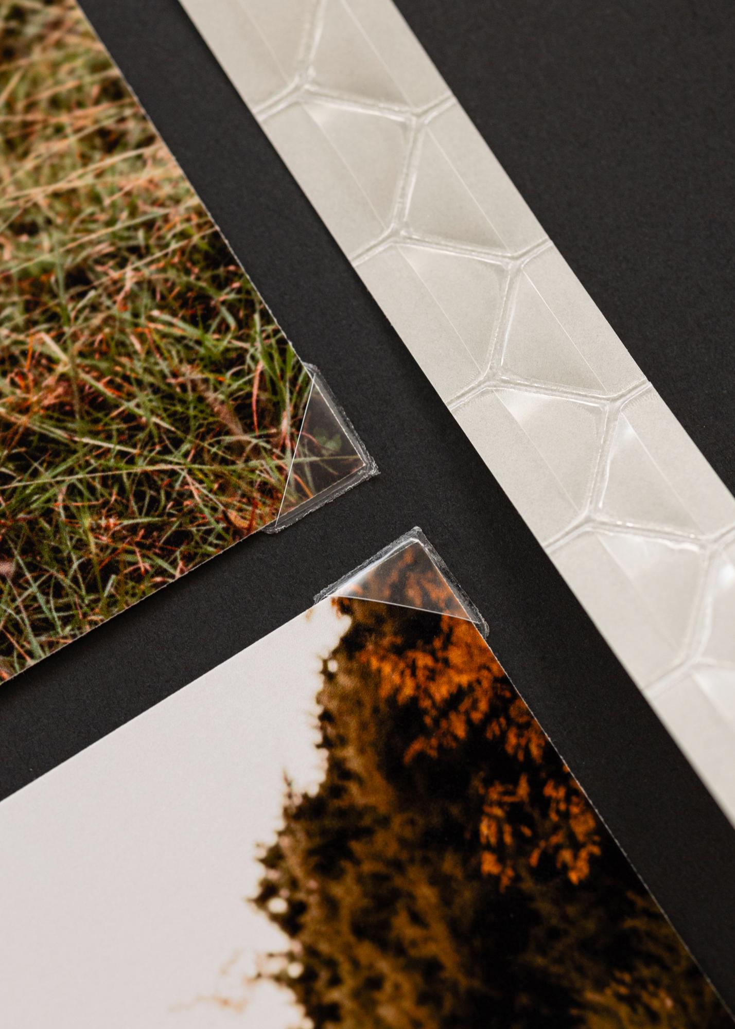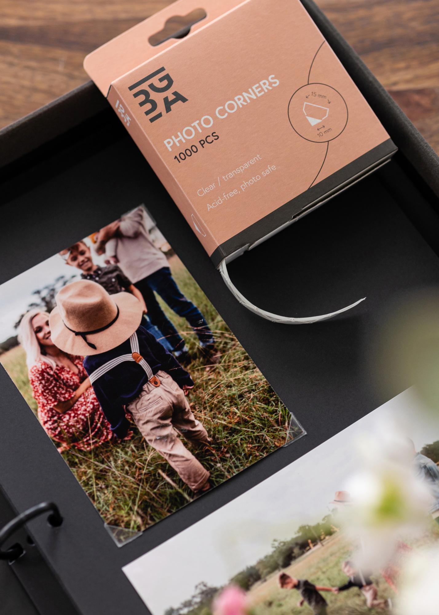 Les coins photo sont parfaits lorsque, par exemple, vous montez des images dans un album photo et que vous ne souhaitez pas utiliser de colle. Comme vous les attachez aux coins de l'image, vous les protégez aussi contre l'érosion au fil du temps. Le résultat est un montage esthétique, fluide et fiable de vos photos.