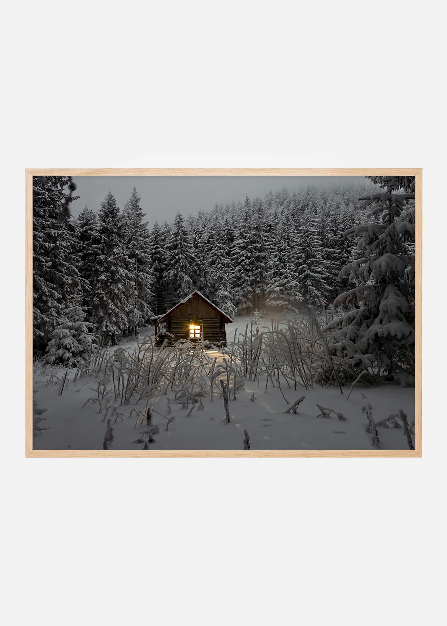 Print avec une adorable petite cabane en rondins sous son manteau d'hiver, profondément dans la forêt de pins. La lumière provenant de la fenêtre qui illumine la nuit d'hiver glaciale donne de la profondeur à la photographie et rend le tableau intéressant. L'image s'adapte à tous les styles de décoration et environnements. Elle sera tout aussi belle dans un cadre métallique noir fin que dans une version plus robuste en bois, ou pourquoi ne pas reprendre la lumière de l'image dans un cadre doré classique.