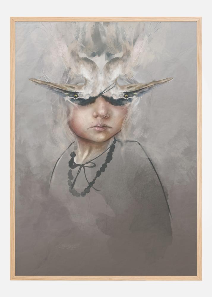 Une affiche déroutante d'une personne enveloppée de fumée. La tête est recouverte d'un chapeau qui semble être en feu et ressemble à deux oiseaux renversés ou à un crâne. Les yeux sont mystérieusement recouverts de lunettes de soleil, tandis que le personnage garde son sang-froid. Ajoutez cette pièce à votre maison pour des interprétations encore plus poussées.
