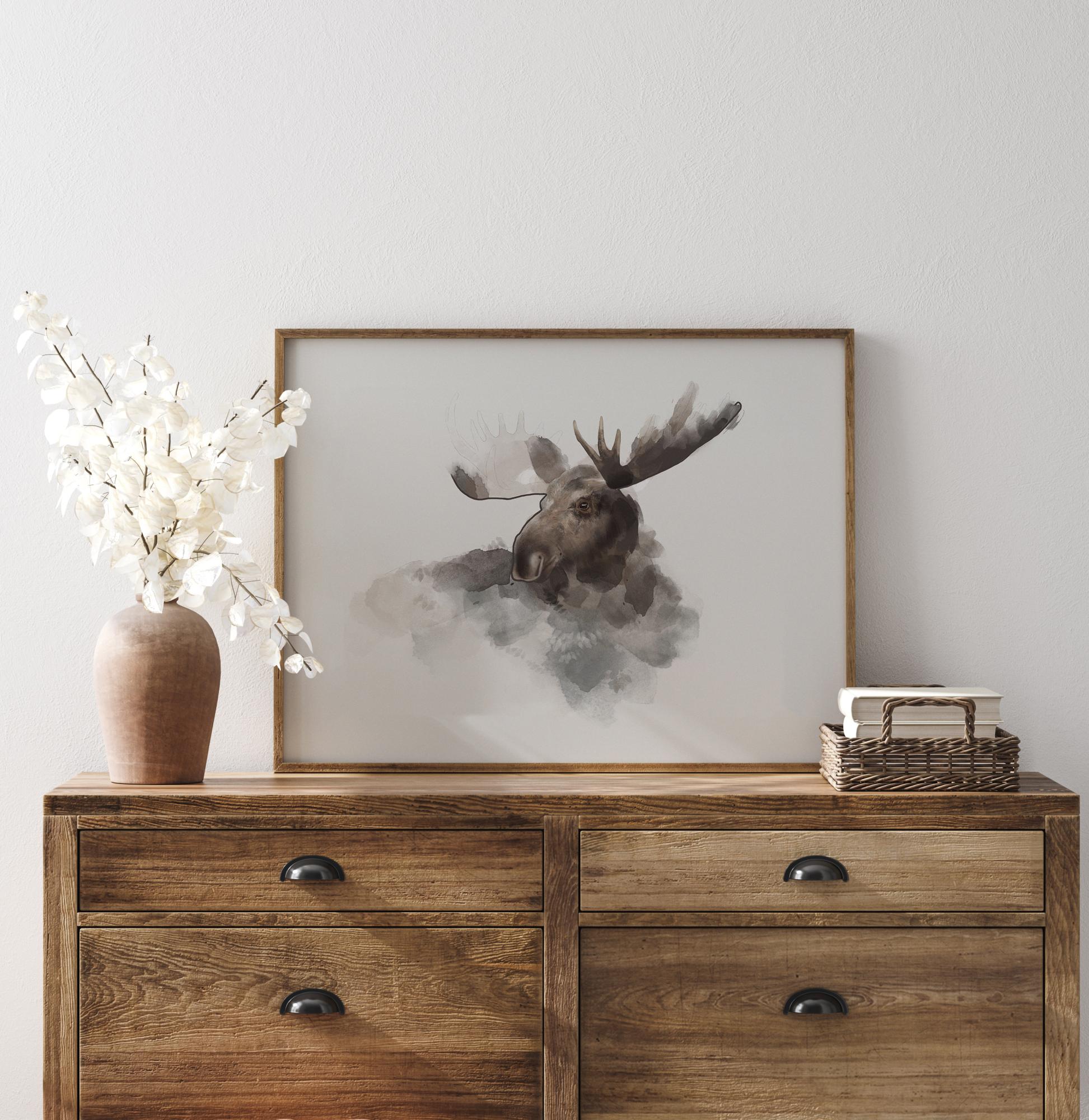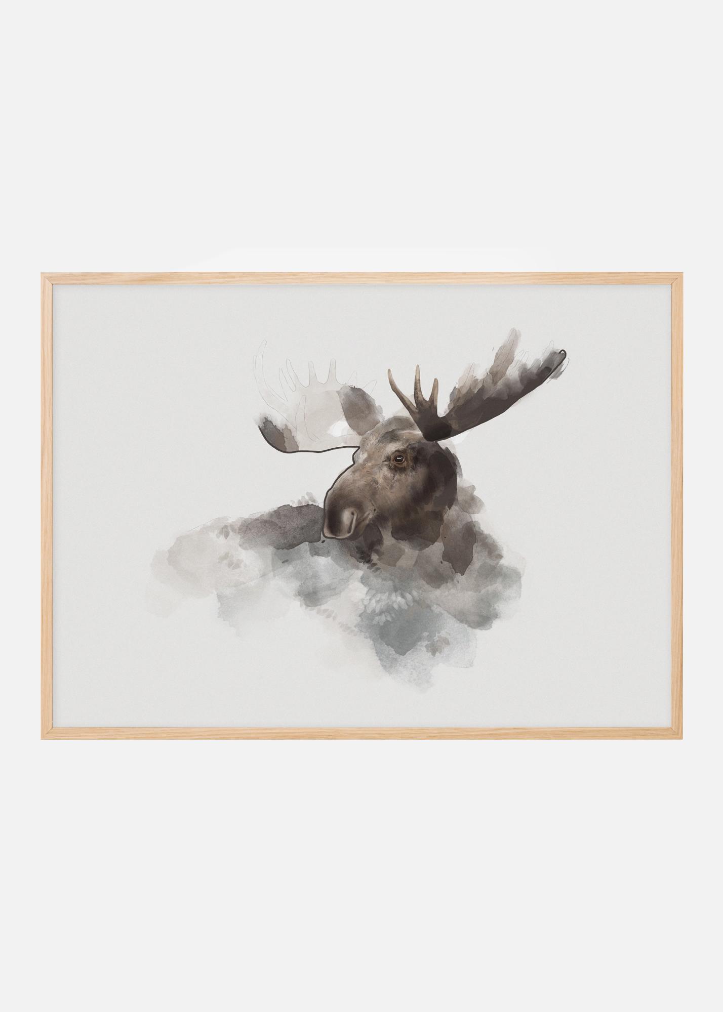 Une aquarelle re présentant la tête d'un élan. Les doux coups de pinceau de l'eau construisent progressivement le visage de l'élan, dont les bois ne sont pas encore complètement formés. Ajoutez cette affiche nuageuse à un mur neutre et doux pour conserver cette élégance dans votre décoration intérieure.