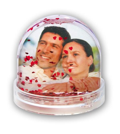 Joli globe photo avec des petits cœurs rouges qui est un cadeau parfait pour quelqu'un que vous aimez. Le globe photo a de la place pour vos propres photos (recto-verso) au format 6,5x6,2 cm.