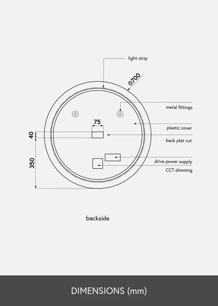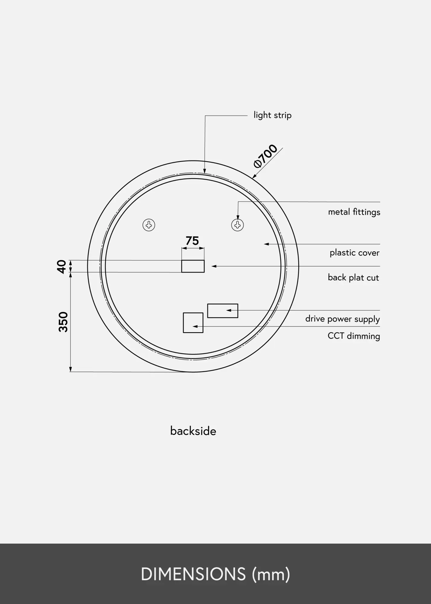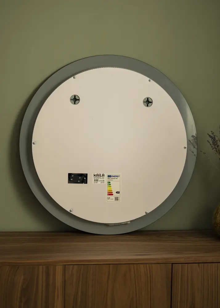 Le miroir est adapté pour les salles de bain mais grâce à son design intemporel et élégant, il a également fière allure sur les autres murs de la maison. Le miroir mesure 70 cm de diamètre, il ne fait que 3 cm d'épaisseur et est doté de supports muraux. Le miroir est destiné à une installation fixe et se connecte à un interrupteur. Afin que le miroir puisse fonctionner correctement, celui-ci doit être connecté à un interrupteur normal et non à un gradateur de lumière.