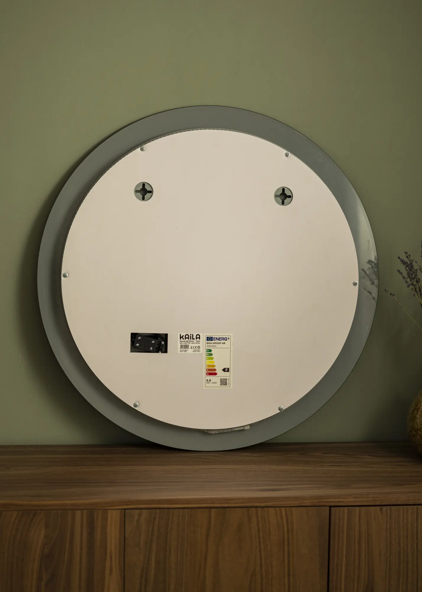 Voici un miroir de salle de bain classique de forme ronde par le suédois KAILA. Le miroir de salle de bain est doté d'un éclairage LED à intensité variable intégré sur son pourtour et qui projette une lumière vers l'arrière, ce qui projette une belle lueur blanche chaude vers l'avant en 3000K. L'éclairage peut s'atténuer, vous pouvez facilement régler la puissance de la luminosité en maintenant le bouton enfoncé pendant quelques secondes. La LED est une source de lumière écoénergétique qui fournit une lumière uniforme et naturelle.
