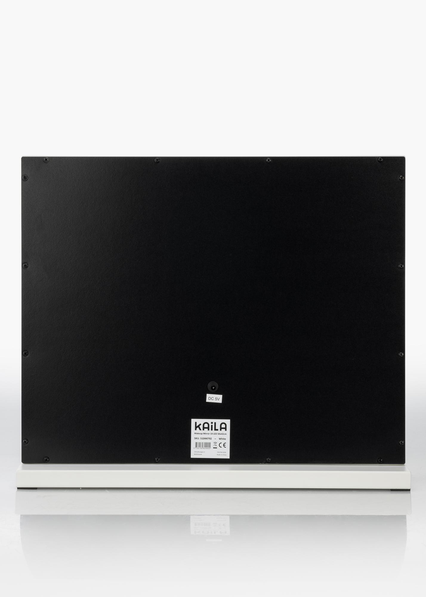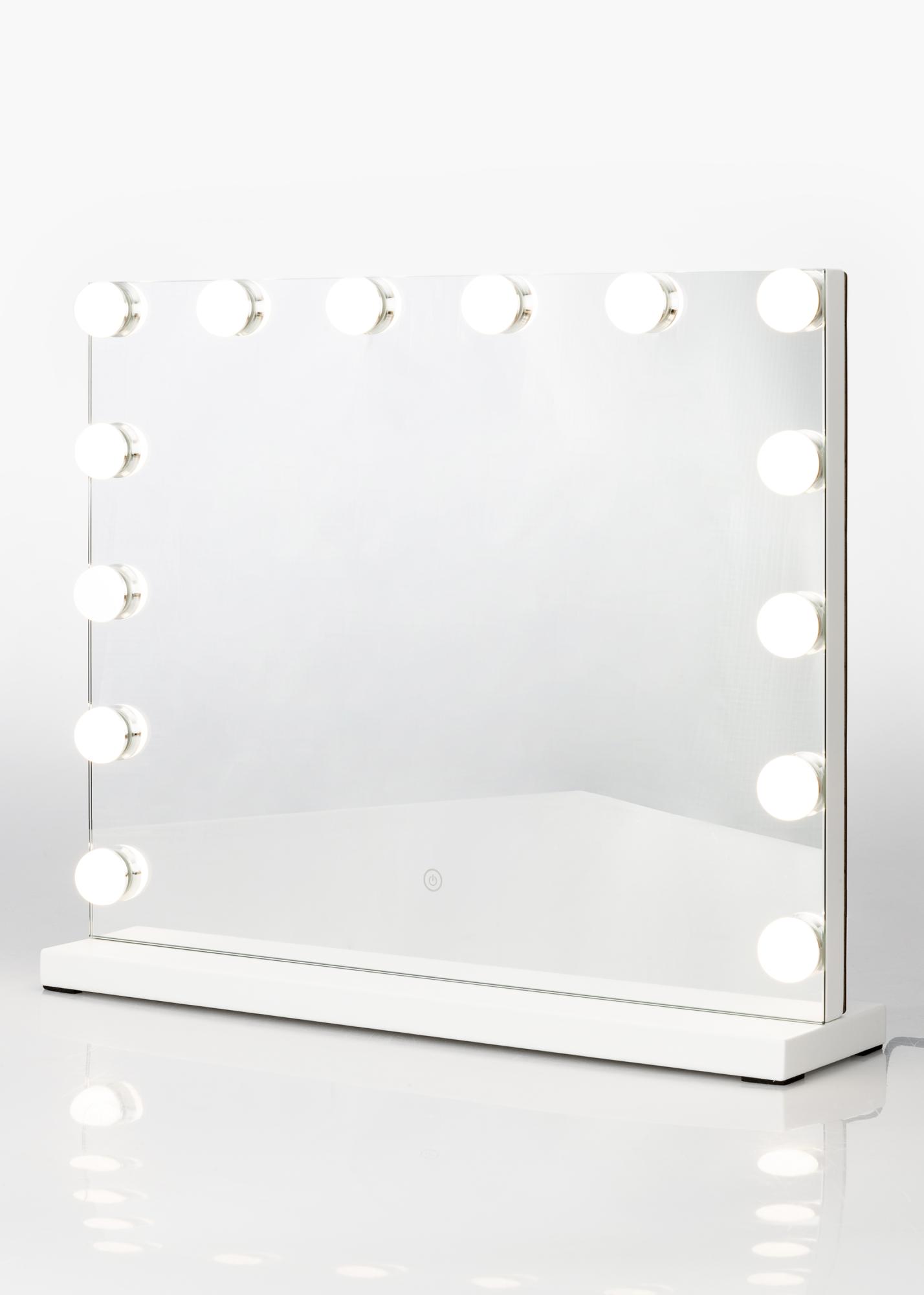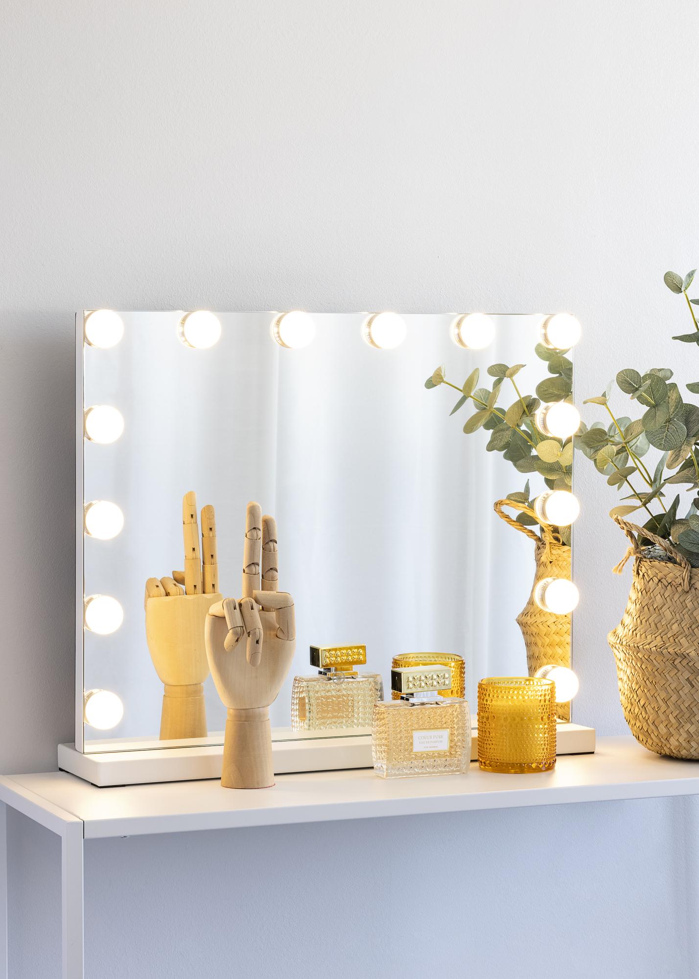 Transformez une pièce en studio de maquillage avec ce luxueux miroir de maquillage de style hollywoodien par KAILA ! Voici un grand miroir de maquillage avec éclairage intégré sous la forme de 14 ampoules LED qui encadrent joliment la grande surface du miroir. L'éclairage LED est ajustable et projette une lumière blanche chaude en 3000K. Vous pouvez facilement allumer l'éclairage en appuyant sur le bouton tactile de l'écran et régler simplement l'intensité en maintenant le bouton enfoncé. Le miroir mesure 50x45 cm.