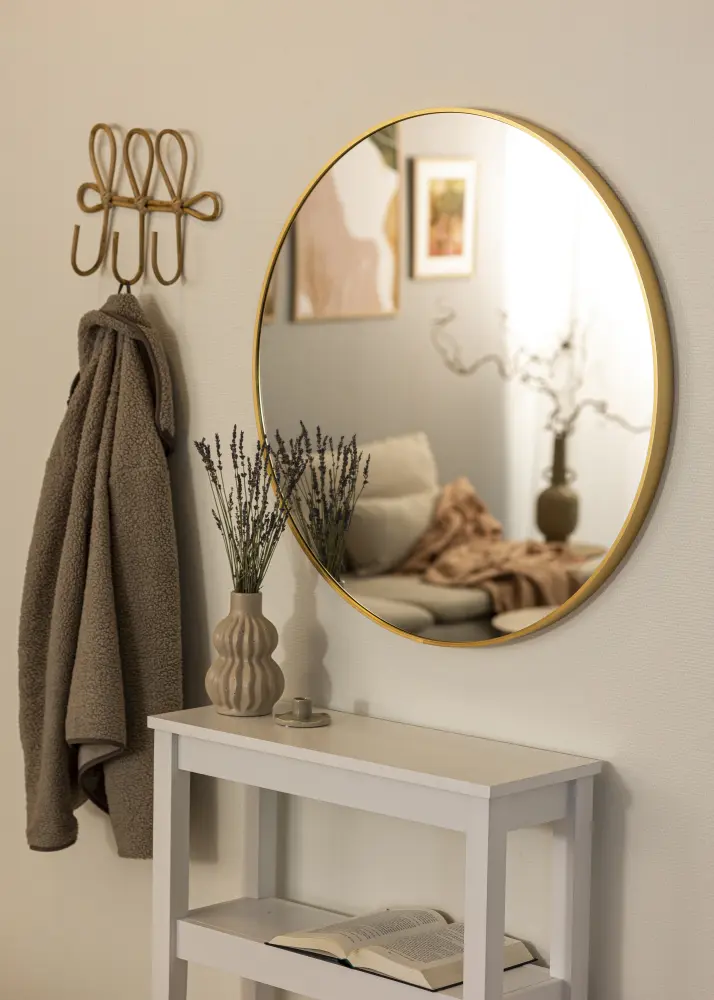 Un miroir rond au design nordique élégant avec un cadre en métal dans une belle finition dorée. Le cadre a une surface brossée, ce qui donne à la belle couleur or un aspect légèrement plus mat. La finesse du cadre est tendance, mais en même temps, en fonction de la taille, le cadre a une profondeur comprise entre 30 et 40 mm, ce qui signifie qu'il sort un peu du mur et crée un effet 3D intéressant. La profondeur du cadre donne également au miroir une sensation de solidité et de robustesse, sans éliminer la sensation minimaliste du miroir.
