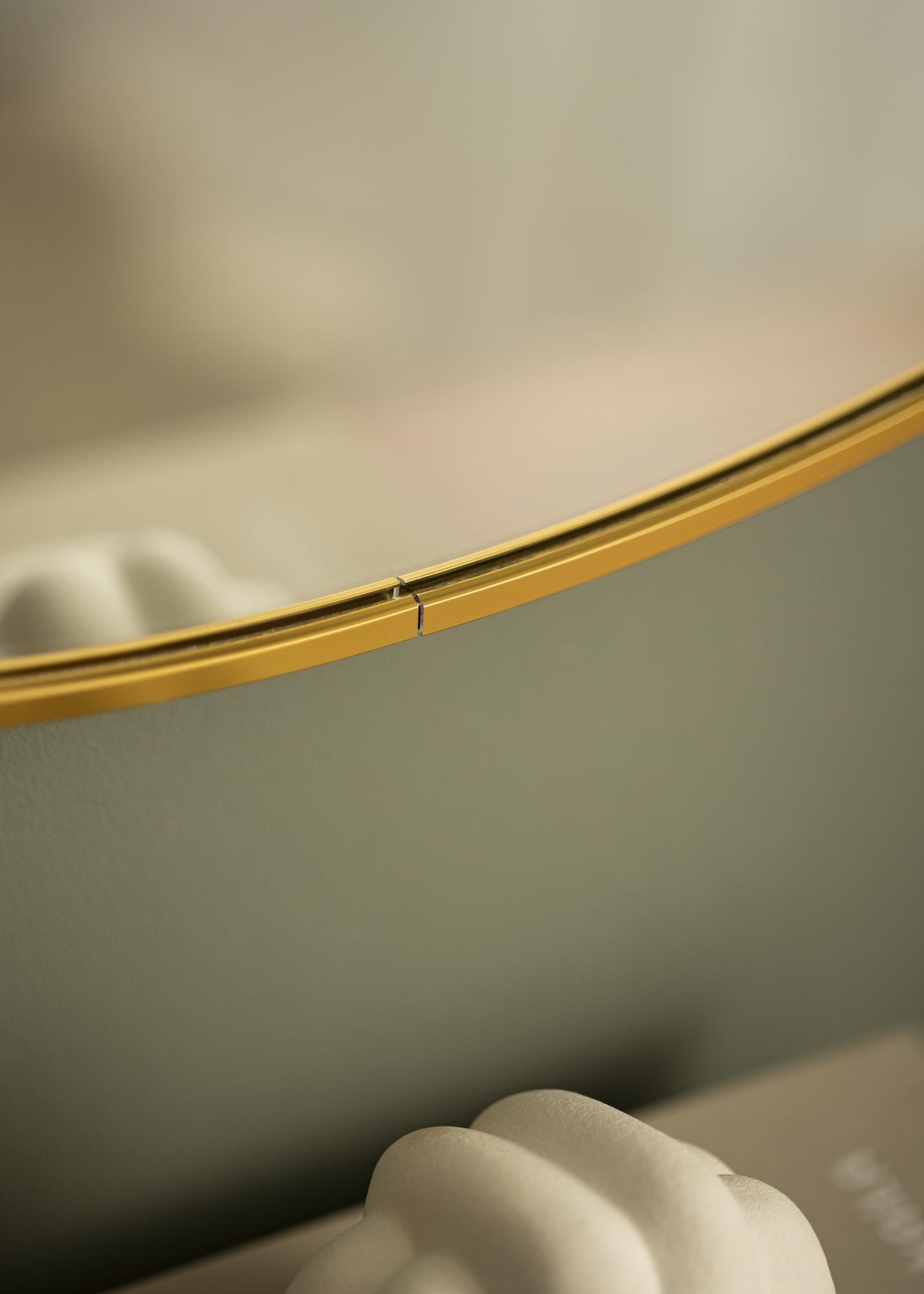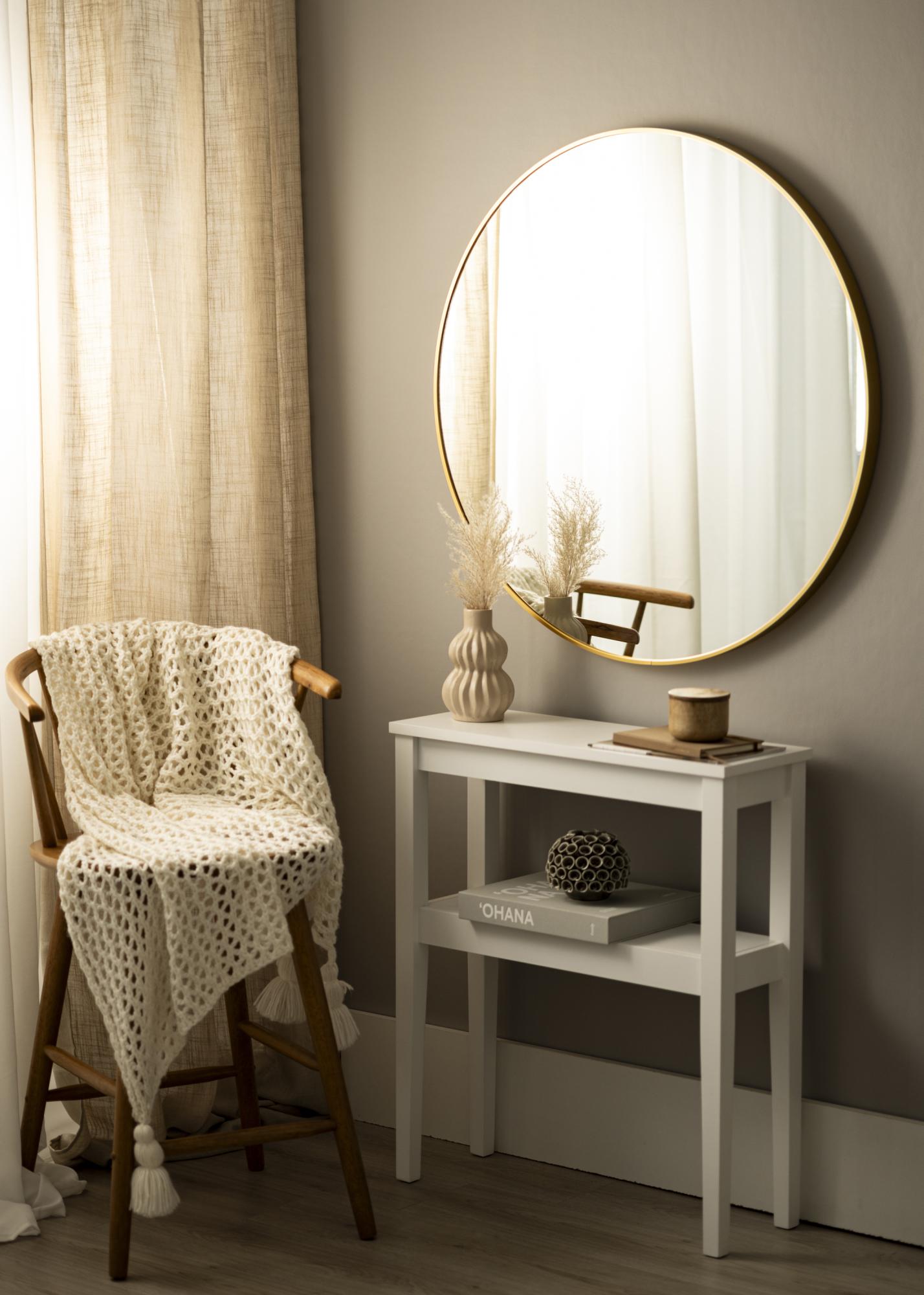Un miroir rond au design nordique élégant avec un cadre en métal dans une belle finition dorée. Le cadre a une surface brossée, ce qui donne à la belle couleur or un aspect légèrement plus mat. La finesse du cadre est tendance, mais en même temps, en fonction de la taille, le cadre a une profondeur comprise entre 30 et 40 mm, ce qui signifie qu'il sort un peu du mur et crée un effet 3D intéressant. La profondeur du cadre donne également au miroir une sensation de solidité et de robustesse, sans éliminer la sensation minimaliste du miroir.