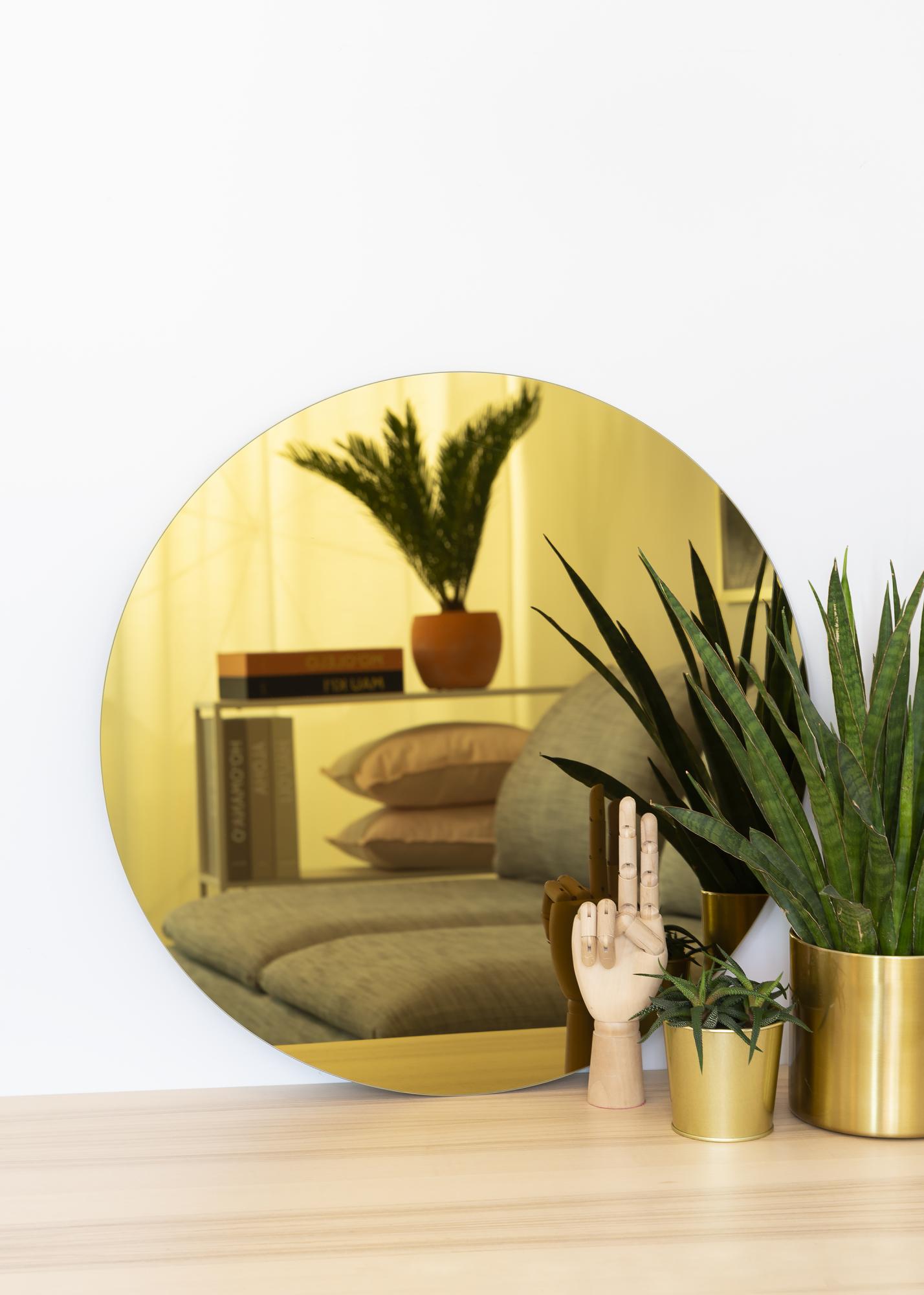 Ce miroir rond a un verre miroir teinté or au plus bel effet qui lui donne une sensation tendance et exclusive. Le miroir est très mince et a un design minimaliste sans cadre, ce qui, en combinaison avec le verre teinté, lui permet de se distinguer de manière très élégante.