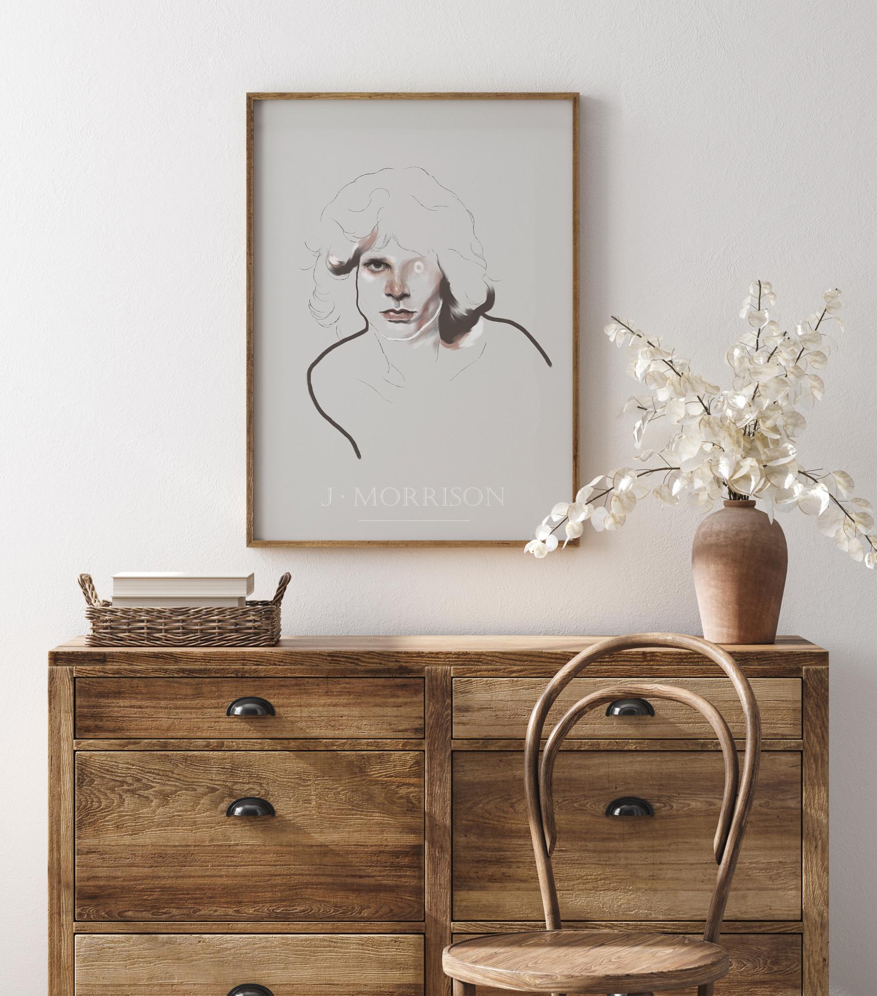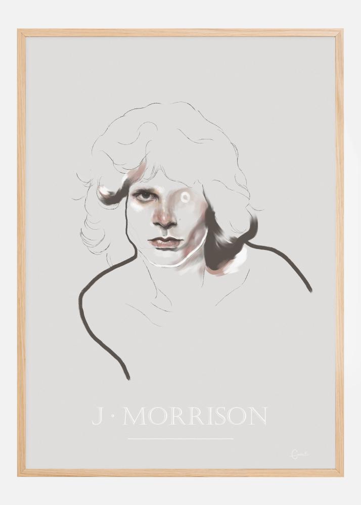 Un magnifique poster de J. Morrison. Sur un fond beige, la tête et les épaules de l'artiste ont été dessinées au stylo noir, tandis que la bouche a été soulignée en brun. L'œil gauche est dépourvu de paupières. Une affiche idéale pour tous ceux qui aiment la musique.
