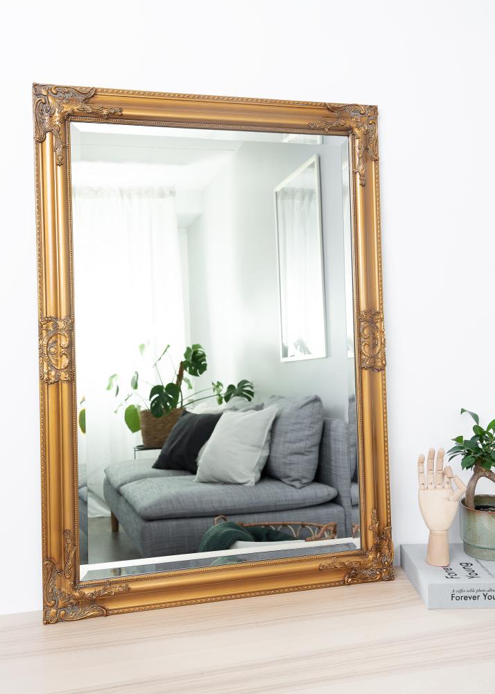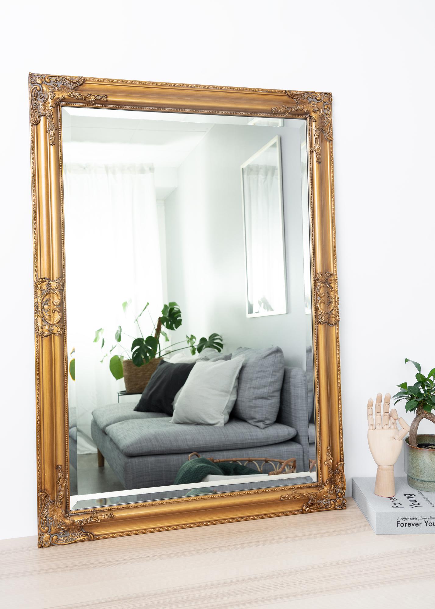 La série de miroirs Bologna or a un design latin paré d'une riche décoration dans les coins et au centre des côtés du cadre. Le cadre de ce miroir est légèrement plus étroit que celui de nombreux autres miroirs de ce style. Ce cadre est en bois et est orné d'une décoration qui a été coulée dans du plâtre avant d'être appliquée sur le cadre. Idéal comme miroir de salle de bain.