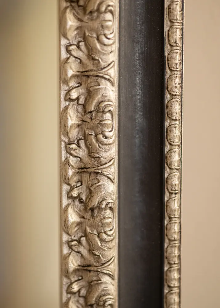 "Drottningholm Argent" est un beau miroir de style retro provenant d'Italie en pin jointé et peint à la main. Le miroir a un profil argenté richement décoré avec un large bord noir qui donne au cadre son aspect élégant.