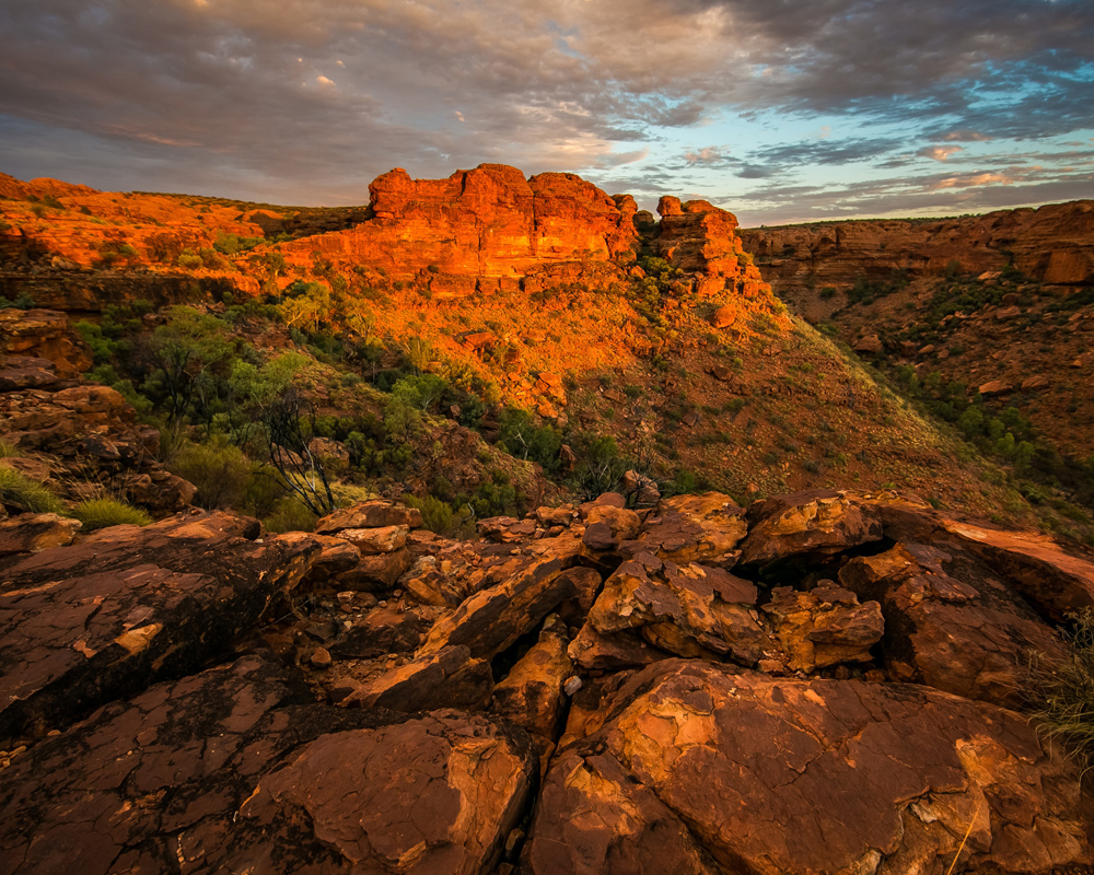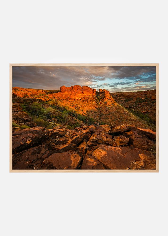 Affiche avec photographie de montagnes rouges arides au coucher du soleil, quelque chose pour ceux qui aiment les déserts et les formations rocheuses à accrocher au mur. Les tons rouges chauds contre le ciel bleu glacé et la profondeur de l'image créent un sujet intéressant. Encadrez le poster avec un joli cadre photo et placez-le sur un mur de tableaux avec d'autres motifs désertiques.