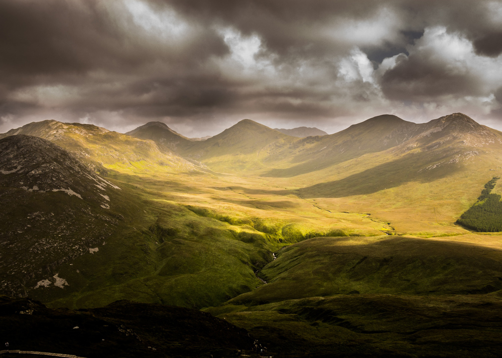 Portrait de paysage dramatique avec des nuages d'orage qui se dressent au-dessus d'une chaîne de montagnes tandis que le soleil illumine la vallée en dessous. Les couleurs sourdes et atténuées soulignent le caractère dramatique de l'image et font que la photographie se démarque vraiment. Convient le mieux dans un cadre qui met en valeur la profondeur de l'image et ne détourne pas l'attention du sujet.
