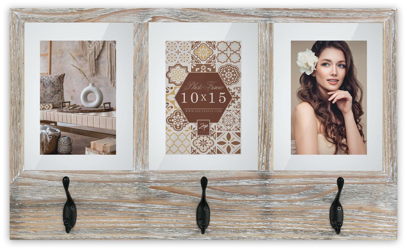 Cadre multivues rustique en bois avec de l'espace pour 3 images aux formats 10x15 cm. Sur les bords du cadre multivues se trouvent 3 crochets décoratifs où vous pouvez choisir d'accrocher une belle décoration, par exemple. Le cadre multivues est fabriqué en bois et il est moucheté d'éléments blancs, ce qui lui apporte une touche champêtre. Supports muraux inclus.