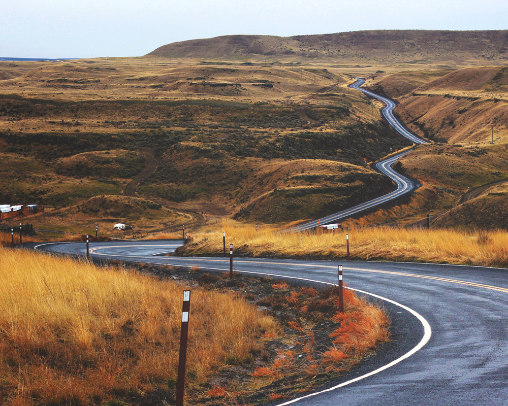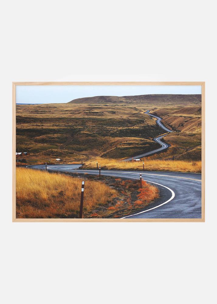 Poster avec une route en asphalte qui serpente à travers un paysage de steppe brûlé par le soleil. Les nuances de jaune-brun de l'herbe contre la surface froide de l'asphalte qui se fraye un chemin à travers le paysage ouvert attirent le regard dans l'image et suivent la route. Le poster convient bien dans un cadre minimaliste où le motif peut être pleinement apprécié et peut être facilement combiné avec d'autres tableaux pour créer un thème.