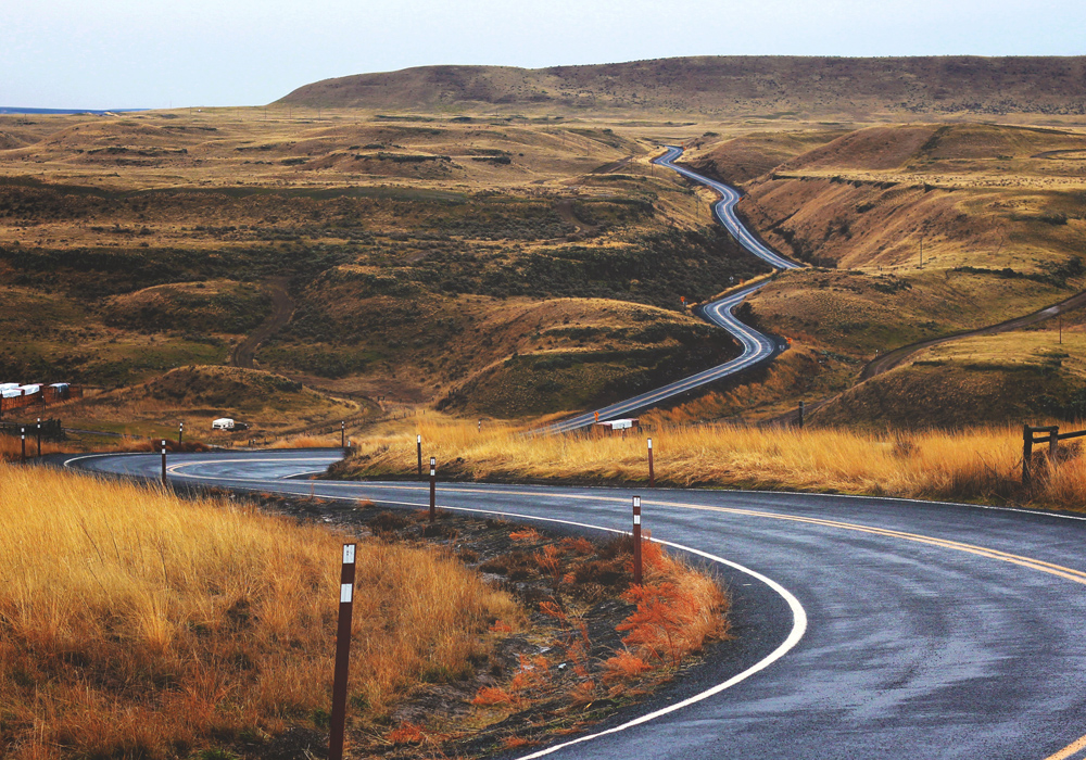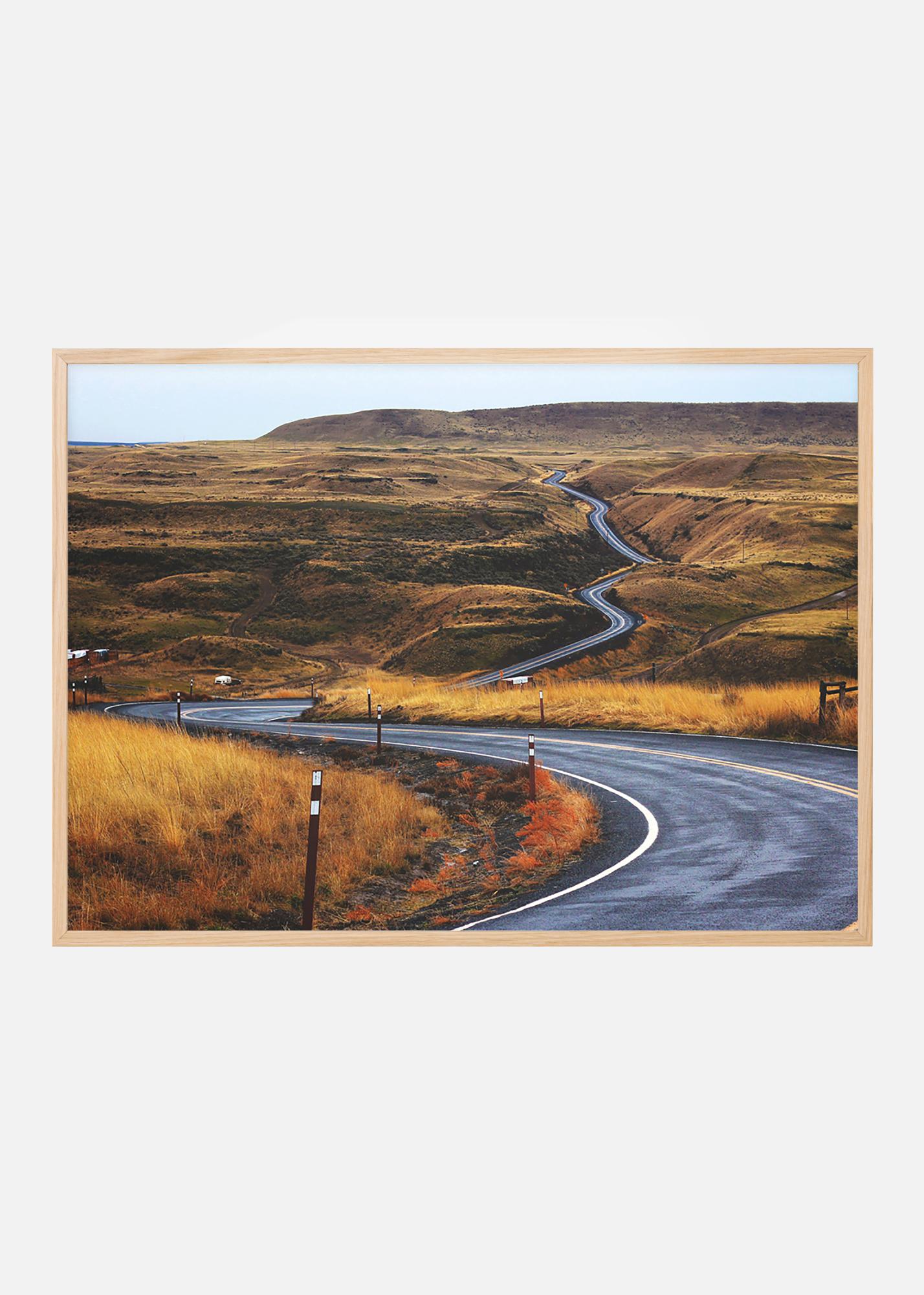 Poster avec une route en asphalte qui serpente à travers un paysage de steppe brûlé par le soleil. Les nuances de jaune-brun de l'herbe contre la surface froide de l'asphalte, qui se fraye un chemin à travers le paysage ouvert, attirent le regard dans l'image et le font suivre la route. Le poster convient bien dans un cadre minimaliste où le motif peut être pleinement apprécié et peut être facilement combiné avec d'autres tableaux pour créer un thème.