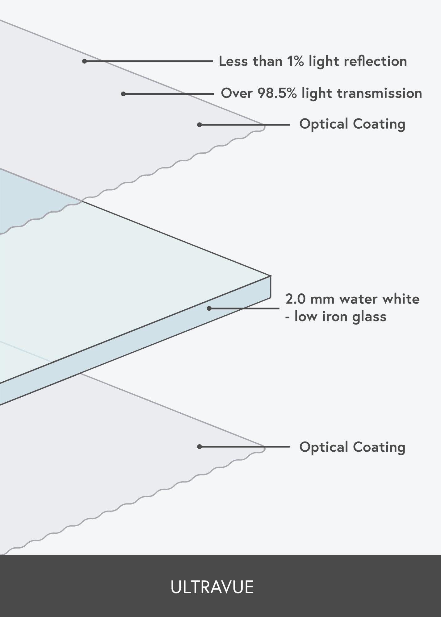 Évitez les reflets gênants avec un véritable verre antireflet de chez Tru Vue. Avec un taux de réflexion de seulement 1 %, le verre est presque invisible et donne à vos images des couleurs naturelles et un lustre réaliste. De plus, le verre est anti-UV et élimine 70 % des rayons UV nocifs, ce qui donne une plus grande longévité à vos images. UltraVue est également résistant aux rayures.