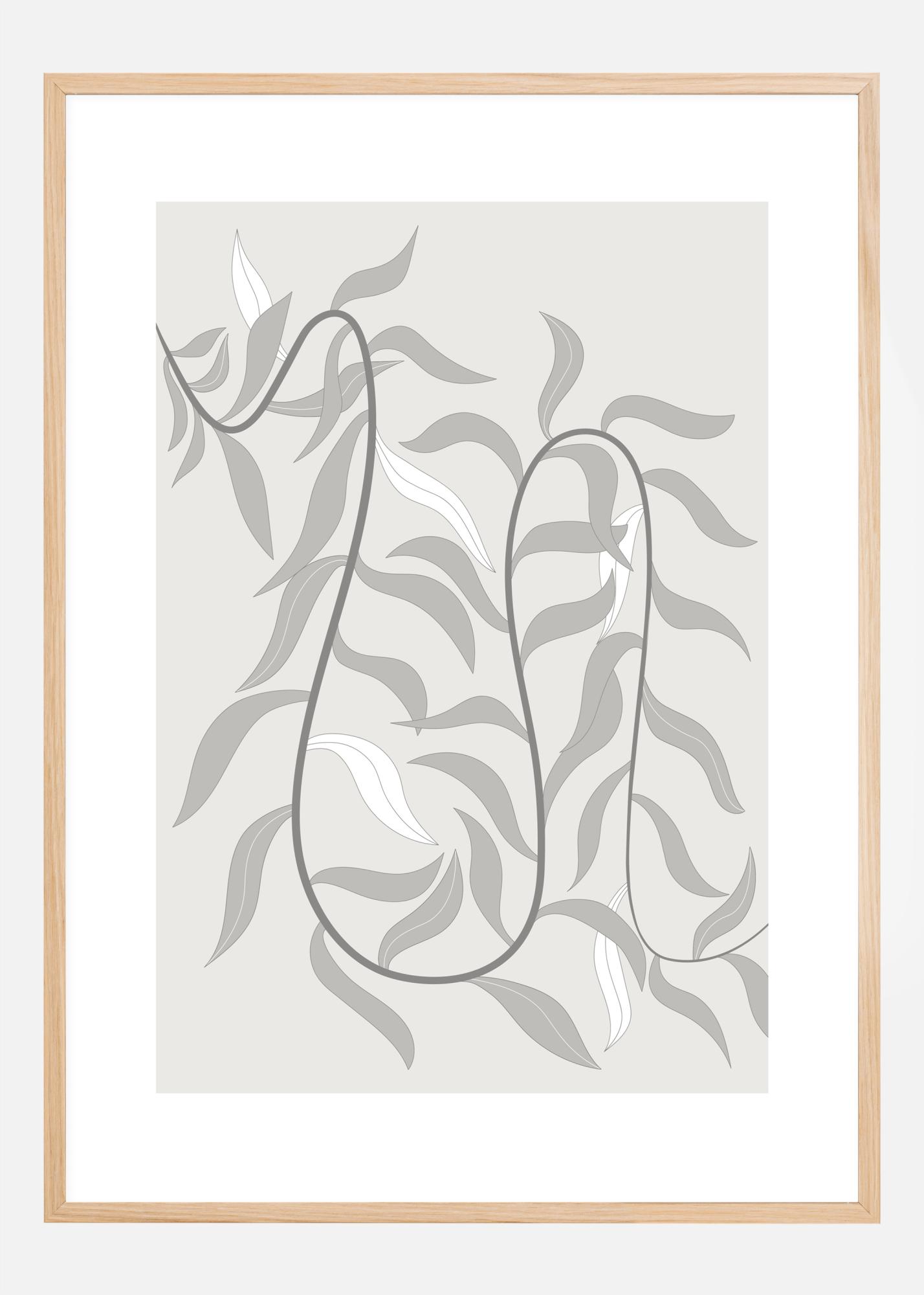 Une affiche botanique abstraite représentant une vigne grimpante qui s'enroule sur l'affiche. Le design est une simple affiche avec des feuilles en gris clair et blanc. Une vigne gris foncé se faufile entre les feuilles pour les réunir en une forme sinueuse. Associez-le à un mur vert tendre pour obtenir un effet feuillu.