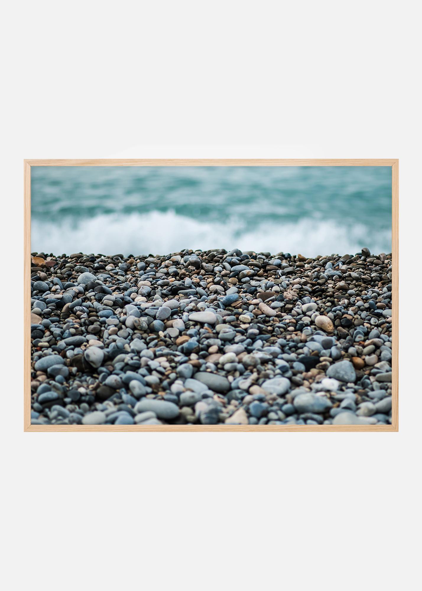 Écoutez le bruit des vagues de la mer depuis ce poster avec une belle plage de galets au premier plan. La faible profondeur de champ donne une image intéressante qui attire les yeux dans l'image. Trouvez-vous un morceau de verre poli parmi les pierres ? La palette de couleurs gris-bleu se marie bien avec un cadre fin contre un mur clair, idéalement avec des accessoires marins.