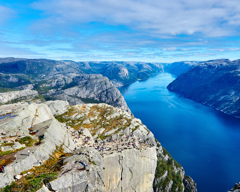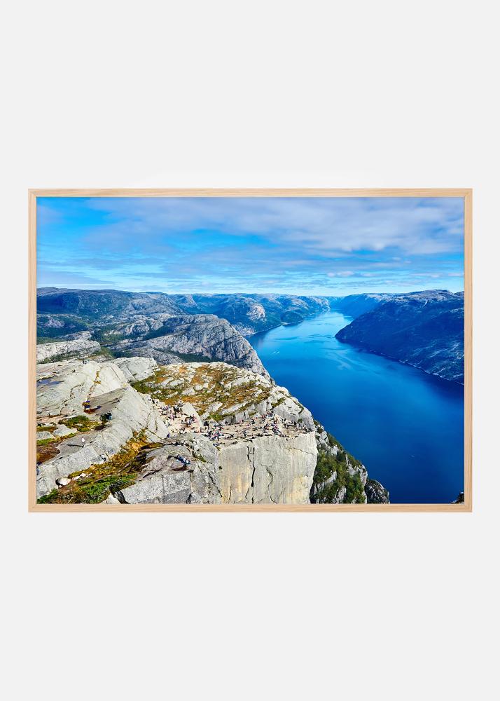 Photographie avec une vue à couper le souffle sur des kilomètres d'une profonde vallée de fjord. Le poster est dans des tons bleus marins avec des falaises nues illuminées par le soleil de chaque côté du fjord, un paysage grandiose qui convient au mur de ceux qui apprécient un beau scénario naturel. Complétez l'image avec un cadre qui met en valeur le motif.