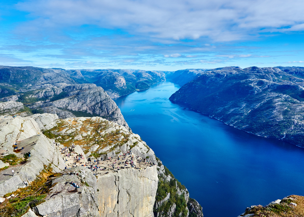 Photographie avec une vue à couper le souffle sur un profond vallon de fjord. Le poster est dans des tons bleus marins avec des falaises nues illuminées par le soleil de chaque côté du fjord, un paysage grandiose qui convient au mur de ceux qui apprécient un beau scénario naturel. Complétez l'image avec un cadre qui met en valeur le motif.