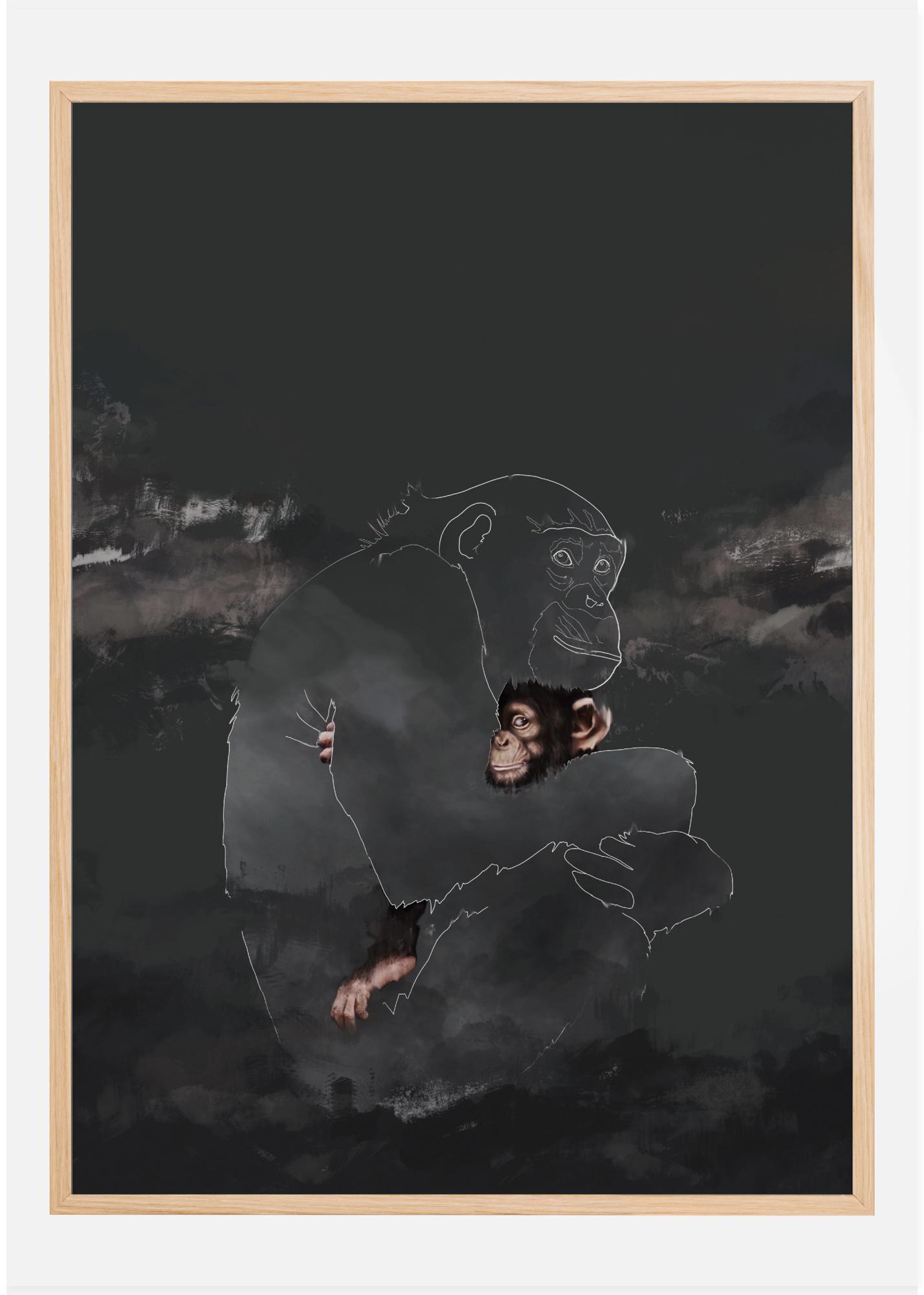 Un poster émouvant d'un bébé chimpanzé serrant dans ses bras l'image stylisée de sa mère. Wish You Were Here est une image émouvante où le bébé chimpanzé n'étreint rien d'autre que le contour de sa mère assise dans le ciel noir sur des nuages doux.