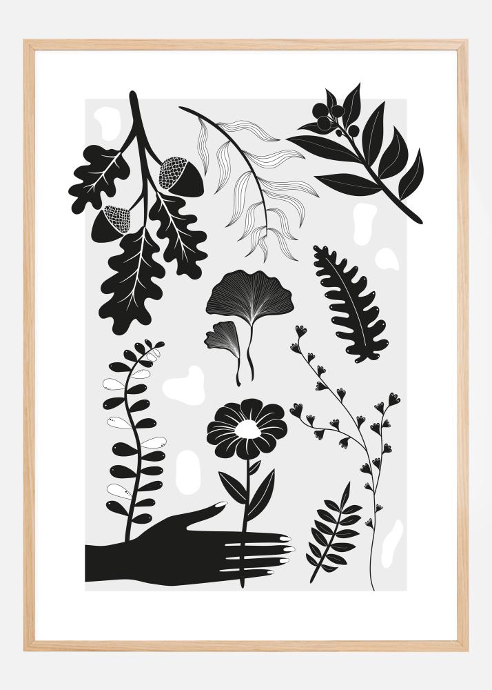 Une affiche audacieuse avec des motifs imprimés en noir et blanc de différentes feuilles, plantes et fleurs. Une main noire se tend pour saisir l'une des fleurs stylisées. Des glands, des fleurs, des fougères et autres remplissent cette impression simple mais intéressante. Ajoutez une touche botanique à votre intérieur avec ce poster de plantes.