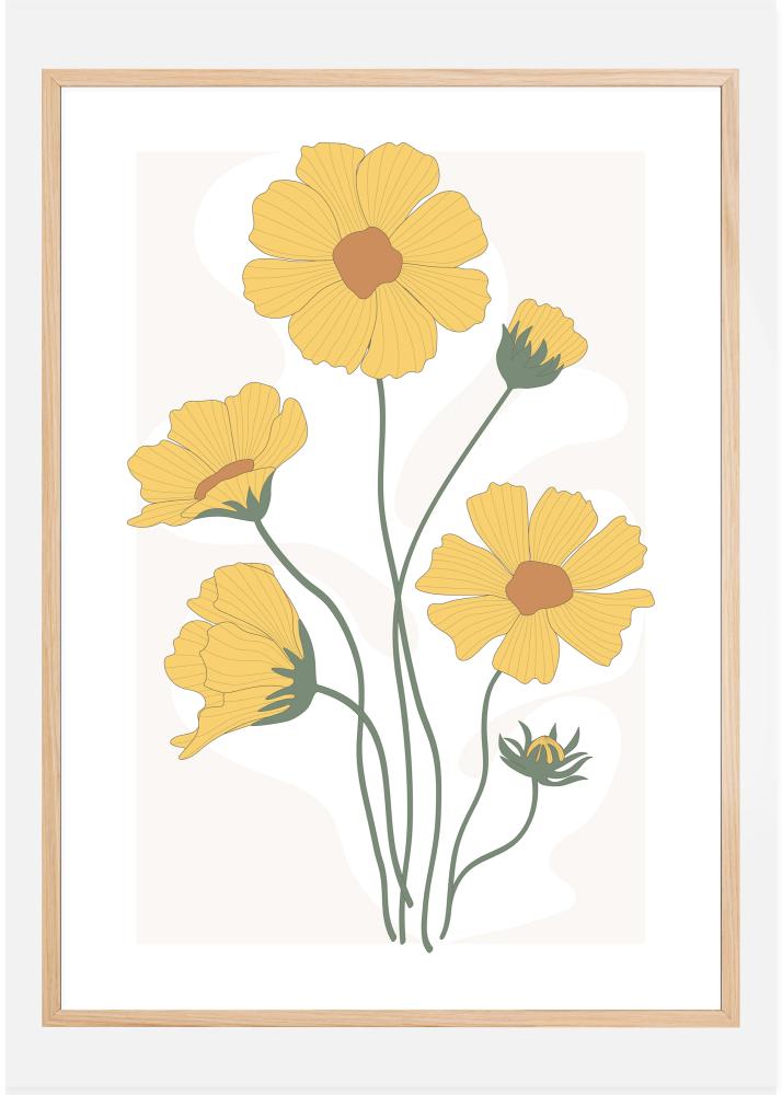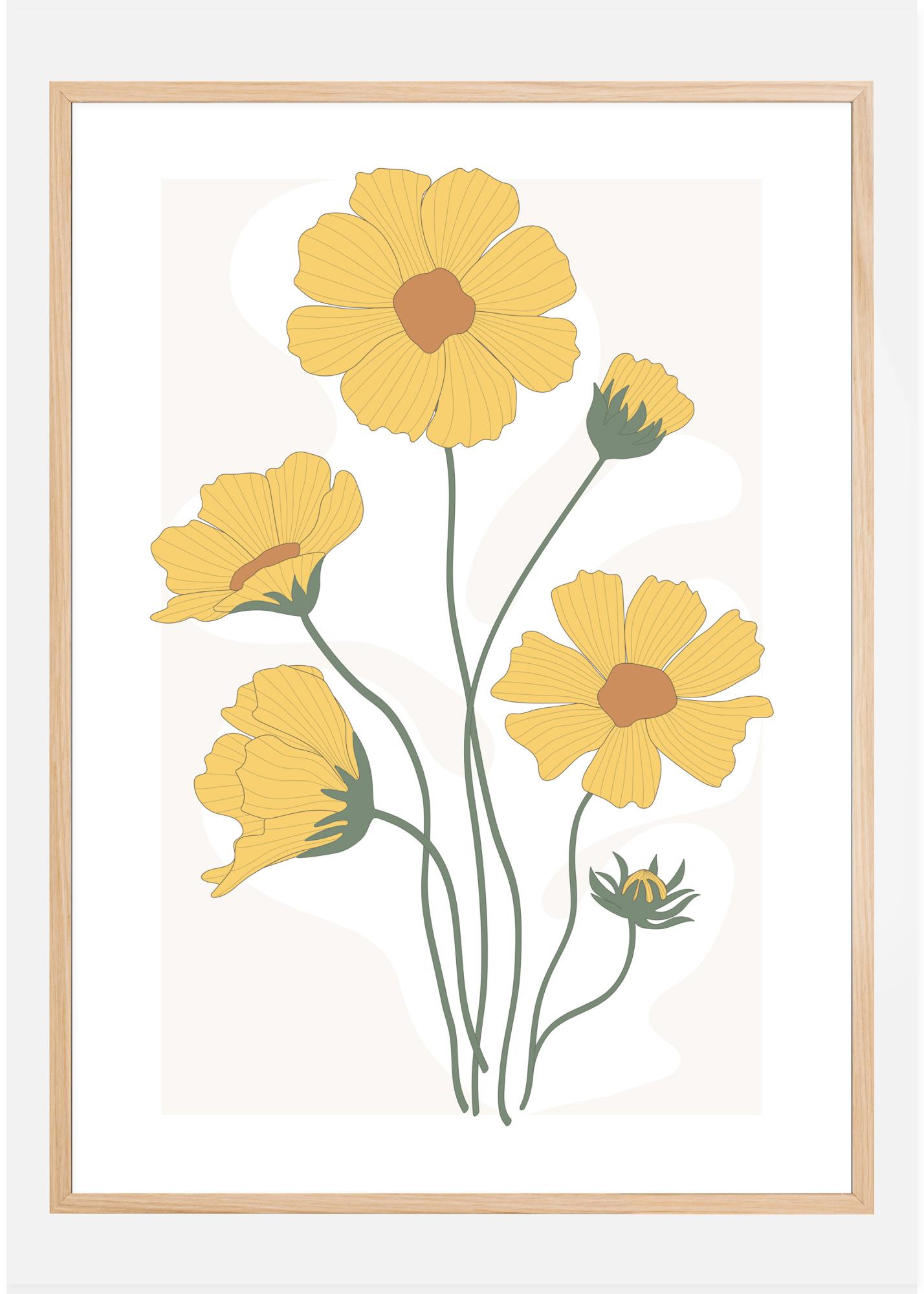 Une affiche lumineuse de soucis jaunes créée dans un style d'impression amusant. Chacune des fleurs brille sur le fond blanc. Bien qu'il s'agisse d'un simple dessin stylisé, les fleurs sont gaies et représentent le moyen idéal pour vous réveiller avec un sourire sur le visage.