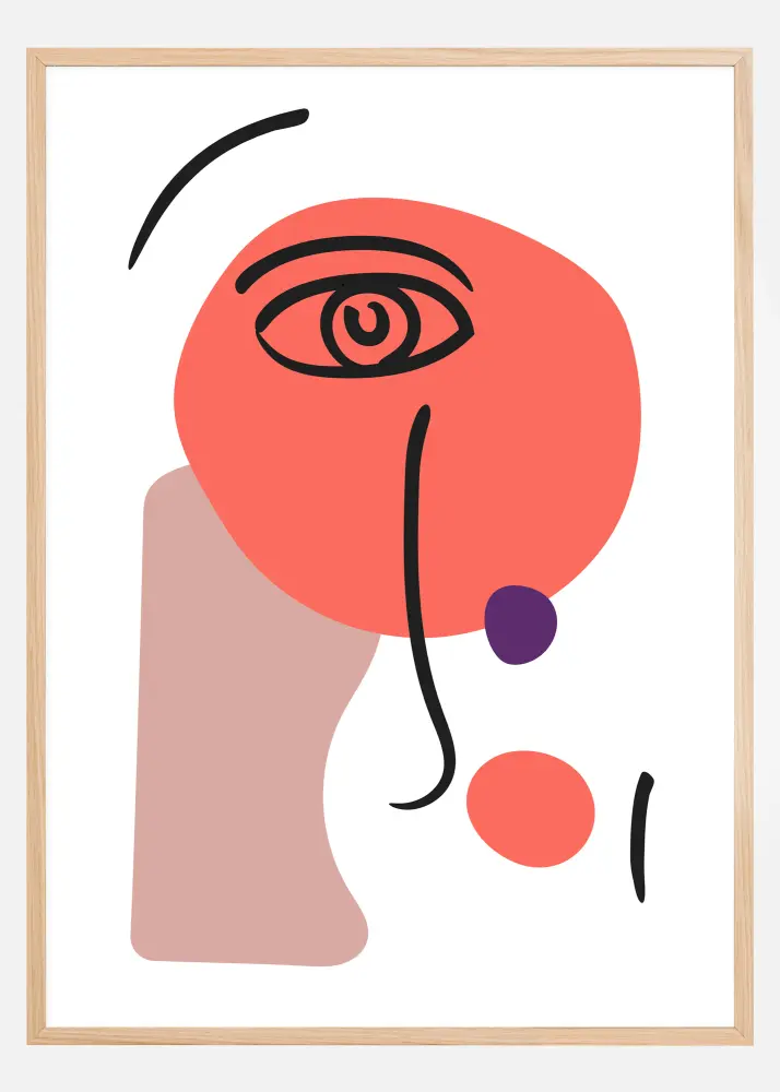 Une affiche abstraite amusante d'un visage joufflu. Le visage est créé à partir de tourbillons noirs pour le nez, les lèvres et les yeux. Les lignes fortes reposent sur de douces formes rose pastel et pêche, chacune avec un bord rond et lisse. Faites entrer l'art moderne dans votre maison avec ce poster charmant et amusant à regarder.