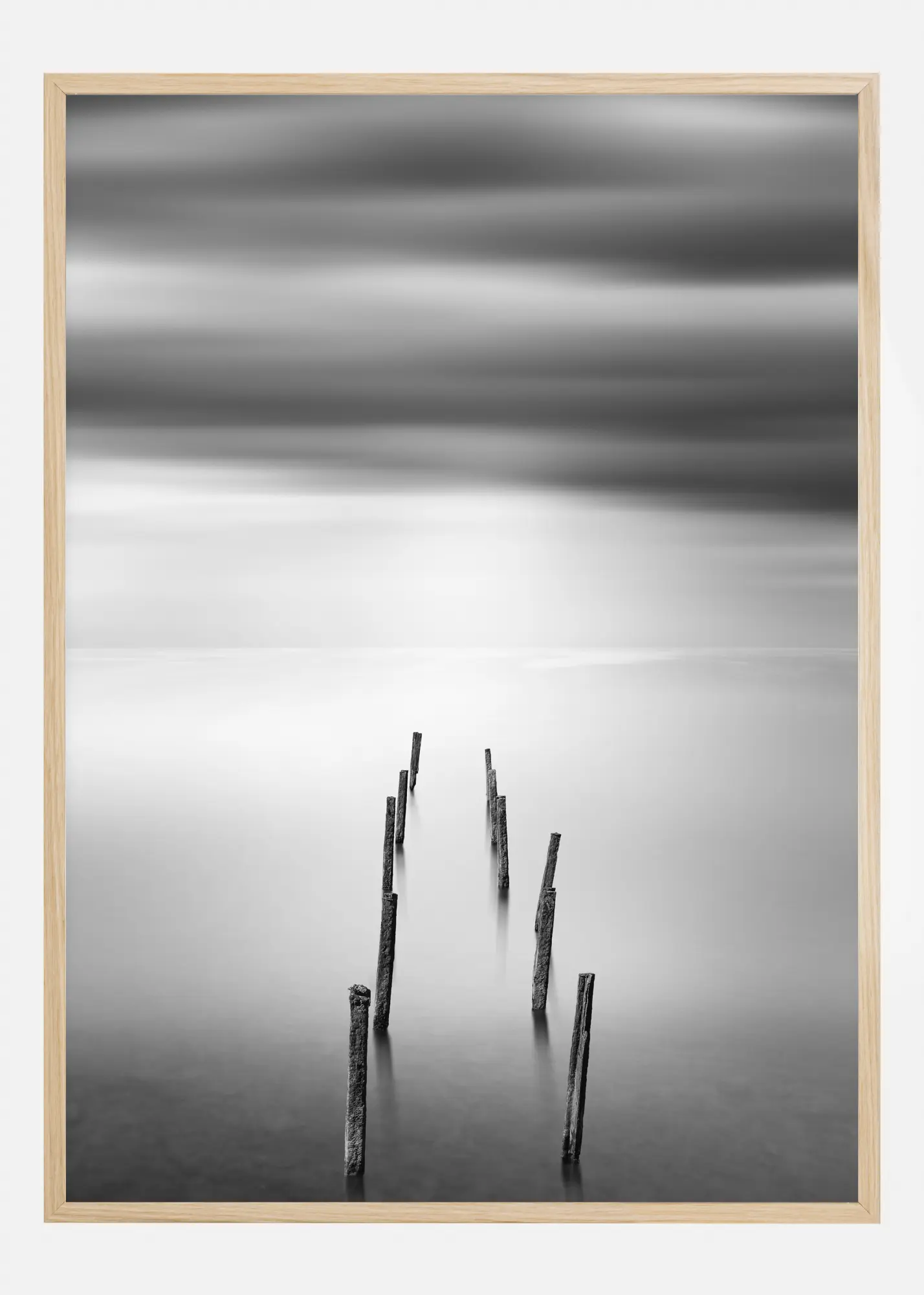 Une affiche de paysage avec un lac et un ciel presque vides. Les tons gris et bleus subtils de cette œuvre se mélangent de sorte qu'il est difficile de voir où le lac et le ciel se rencontrent. De vieux poteaux de quai en bois vous mènent au lac, mais c'est à vous de décider jusqu'où vous voulez aller.