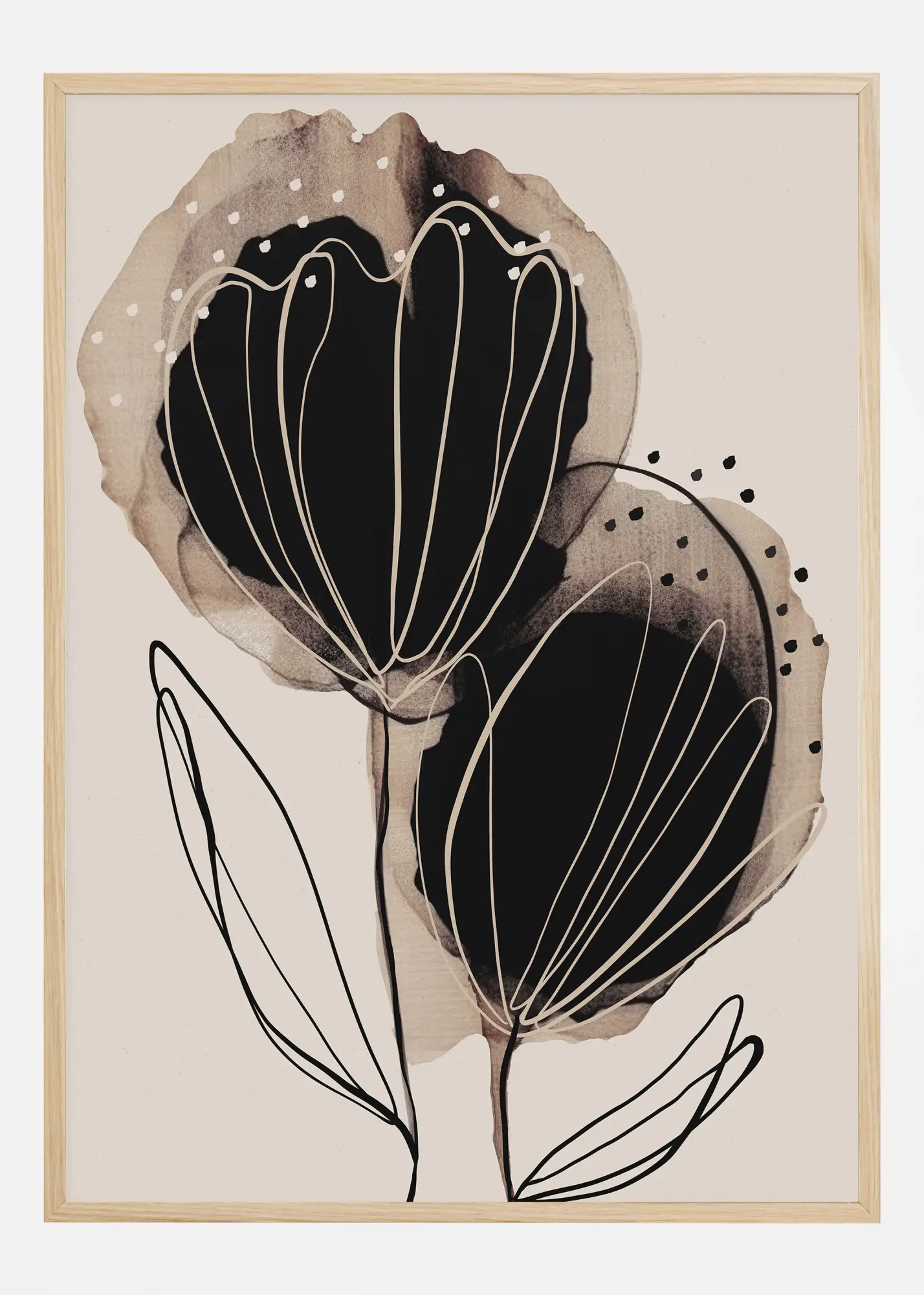 Explorez l'expression dramatique et artistique de notre affiche florale abstraite. Cette affiche unique évoque une forte sensation d'élégance et de contraste à travers ses contours noirs audacieux qui représentent les silhouettes des fleurs. Le thème floral abstrait est présenté de manière sophistiquée avec un fond de nuances douces de sépia et de beige, offrant un arrière-plan chaleureux et accueillant aux détails noirs intenses.