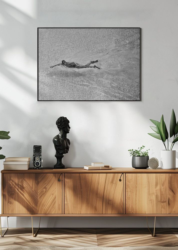Cette affiche élégante capture l’instant d’un nageur en mouvement, avec des lignes raffinées qui créent une sensation de dynamisme. L’image est en Noir et blanc, ce qui confère au motif une esthétique intemporelle et classique. Le mouvement de l’eau autour du nageur apporte une texture fascinante qui ajoute de la profondeur à la composition.