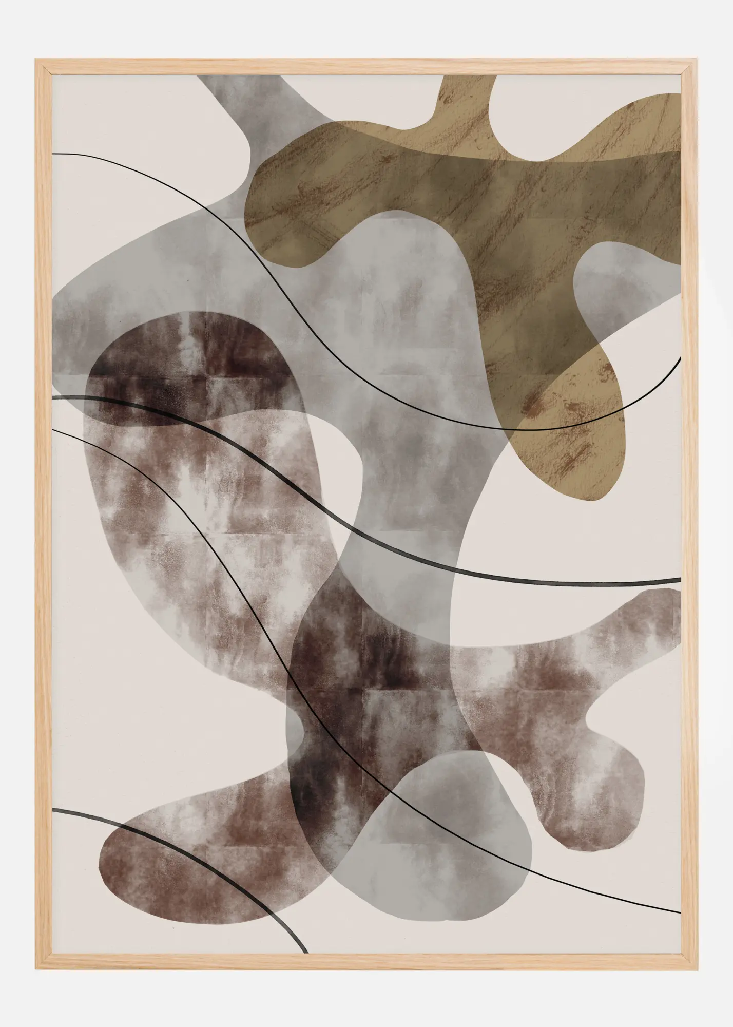 Une affiche abstraite avec des couleurs et différentes formes et lignes étranges. Trois formes principales en jaune, rouge et gris ressemblantes à des éclaboussures de peinture remplissent l'image. Quatre lignes noires ondulées tourbillonnent sur elles. Ajoutez ce poster à votre mur et transformez votre maison en galerie.