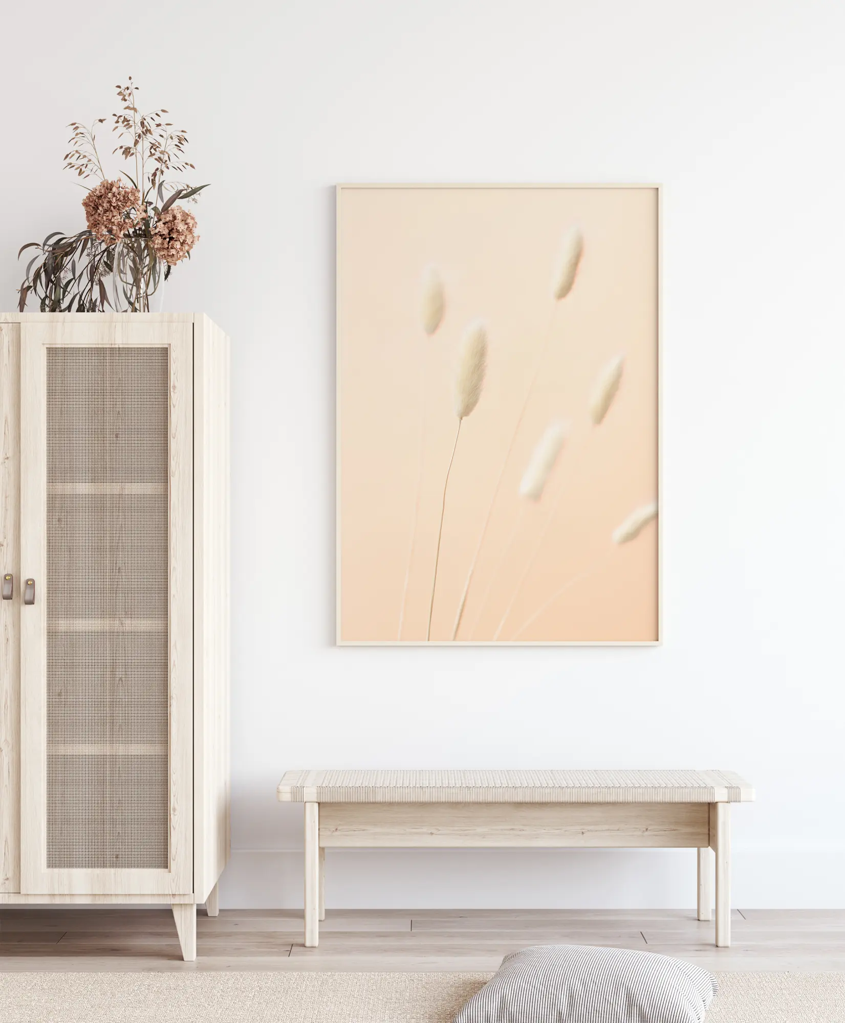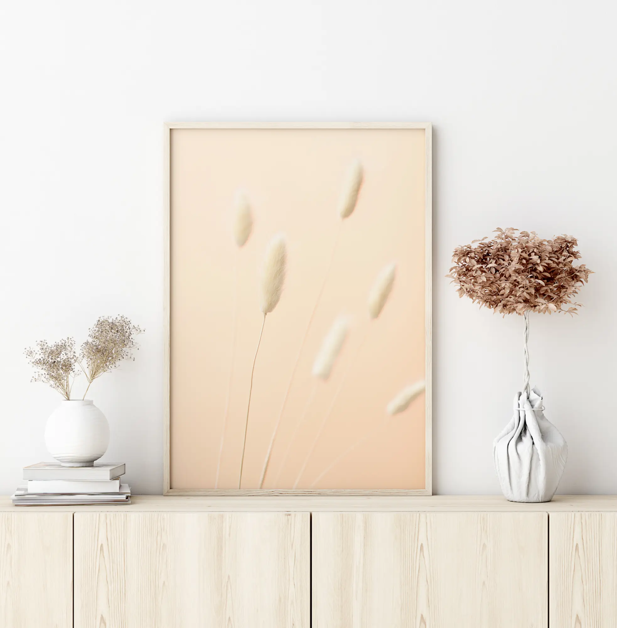 Une simple affiche d’herbes aux écouvillons délicatement posés dans un vase. Les légères tiges duveteuses peignent presque le mur derrière. Ces tons pastel subtils s'accorderont parfaitement avec d'autres ou bien même un mur blanc épuré.