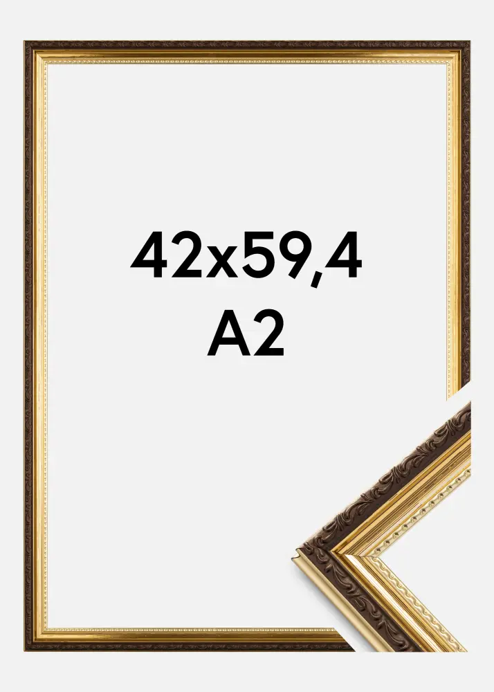 Seriez-vous à la recherche d'un joli cadre décoré dans un style ancien ? Abisko Verre Acrylique Or est un véritable cadre doré avec une ornementation incroyablement esthétique. Les baguettes du cadre d'une largeur de 25 mm sont dans une couleur dorée mate avec une bordure marron ornée au centre. La partie dorée est également décorée, avec un motif ondulé autour du verre.