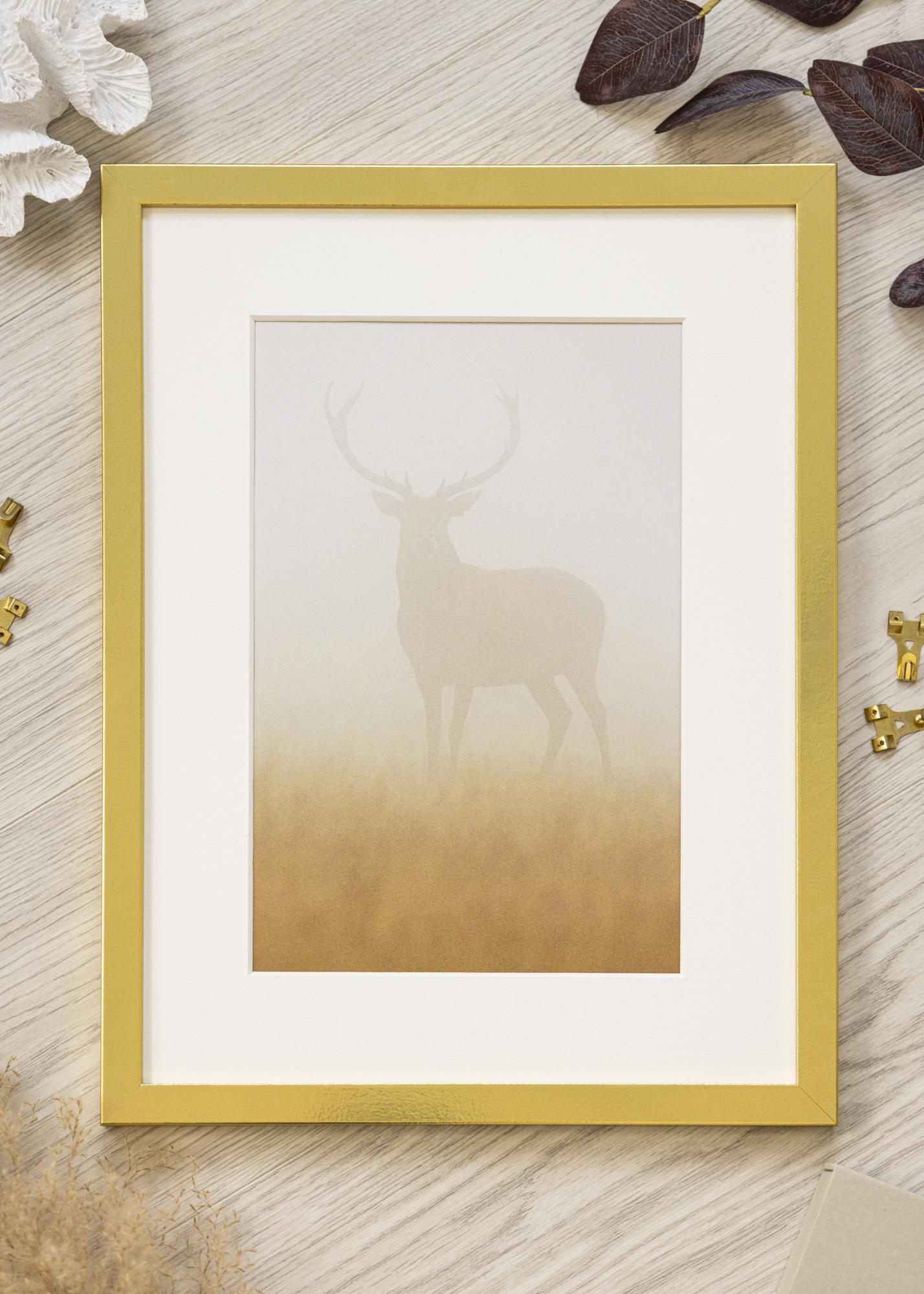 Ce cadre photo doré est une parfaite combinaison d'élégance et de design moderne. Avec un profil épuré et une teinte dorée luxueuse, il apporte une expression sophistiquée à n'importe quelle pièce. Le cadre est en bois et possède une brillance subtile avec une finition légèrement texturée, ce qui renforce son aspect exclusif. Les coins nets et propres contribuent à l'apparence minimaliste, ce qui le rend idéal pour mettre en valeur vos motifs préférés.