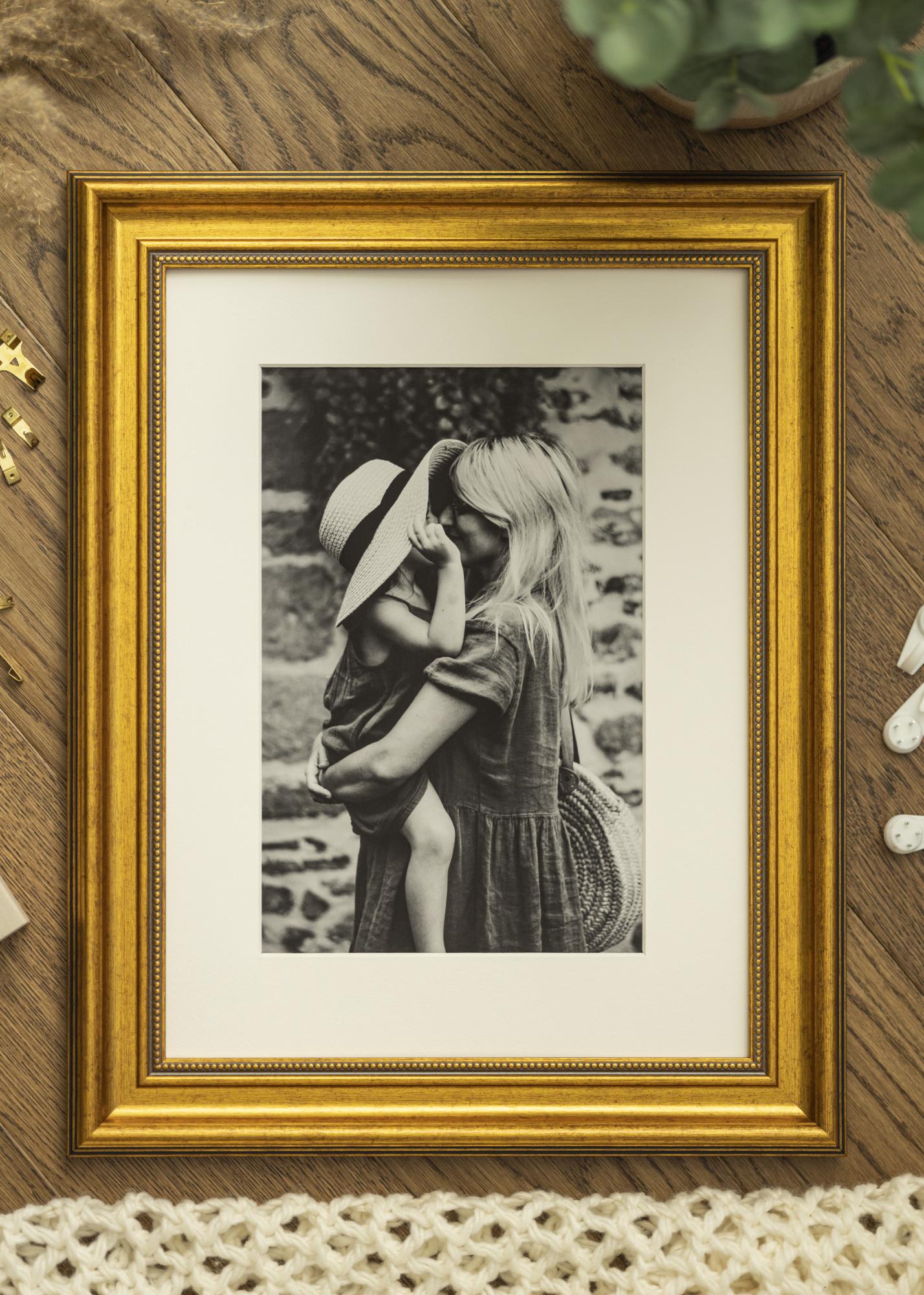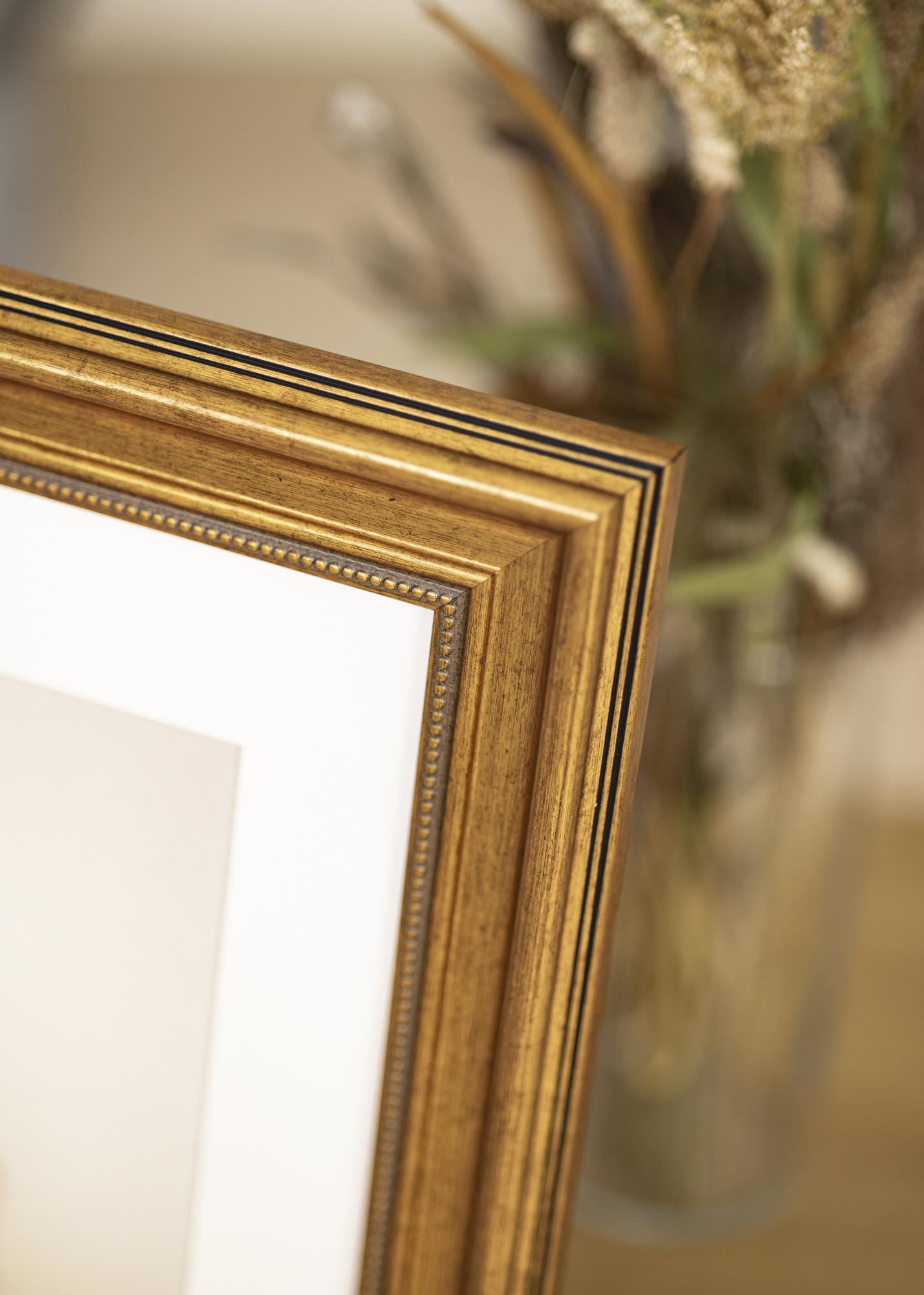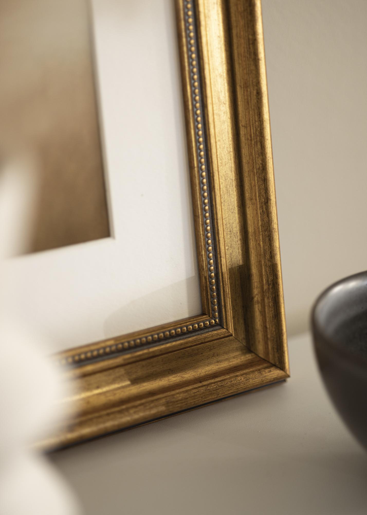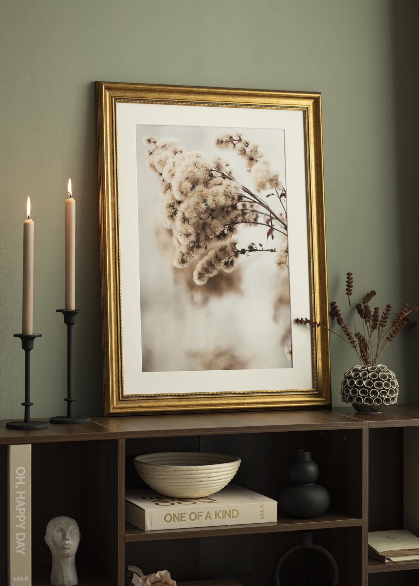 Le Rococo est un cadre doré qui apporte une délicieuse sensation vintage à tous vos motifs favoris. Le cadre dispose d'une baguette de 50 mm de large dans une nuance d'or antique brillant, ainsi qu'une surface magnifiquement usée qui renforce l'aspect classique du cadre. Ce cadre convient aux photographies personnelles ainsi qu'aux posters abstraits – et quel que soit le motif que vous choisissez, vous pouvez l'installer sans problème. Il suffit de retirer le dos du cadre, qui est maintenu en place par de petits clous flexibles, puis de placer votre œuvre d'art contre le verre du cadre.