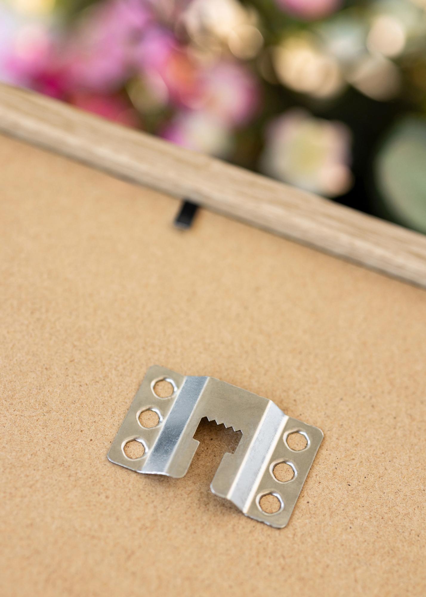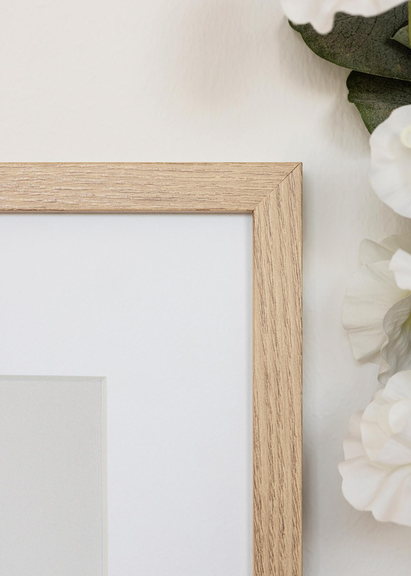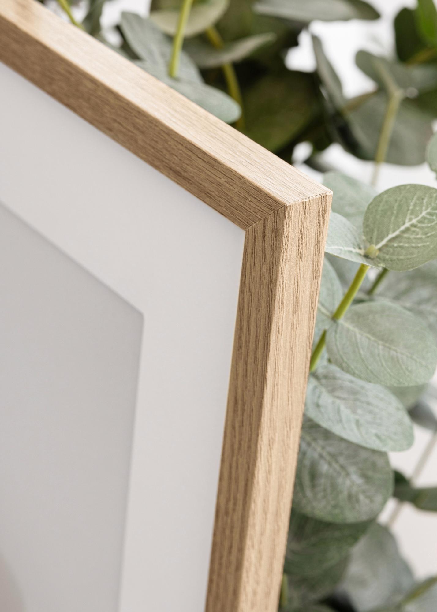 Le cadre, fabriqué en MDF avec placage en aluminium et une surface de couleur chêne est doté d'un mince profil de 14 mm. Il y a suffisamment d'espace pour combiner vos images avec un passe-partout luxueux, grâce à la profondeur intérieure du cadre (profondeur de baguette) de 12 mm.