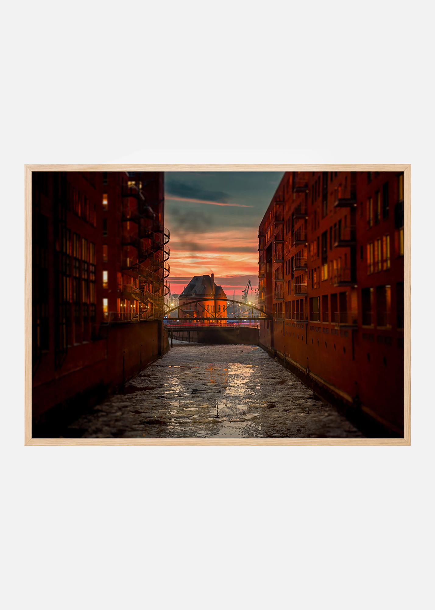 Coucher de soleil sur l'ancien quartier des entrepôts Speicherstadt à Hambourg avec ses canaux et ses bâtiments en brique néo-gothique. La photographie de cette zone protégée comme monument historique s'intègre parfaitement dans le foyer d'un amateur d'architecture ou d'histoire. Le poster est mis en valeur dans un cadre en métal fin qui correspond à l'architecture épurée et est élégant sur le mur, accompagné d'autres images urbaines.