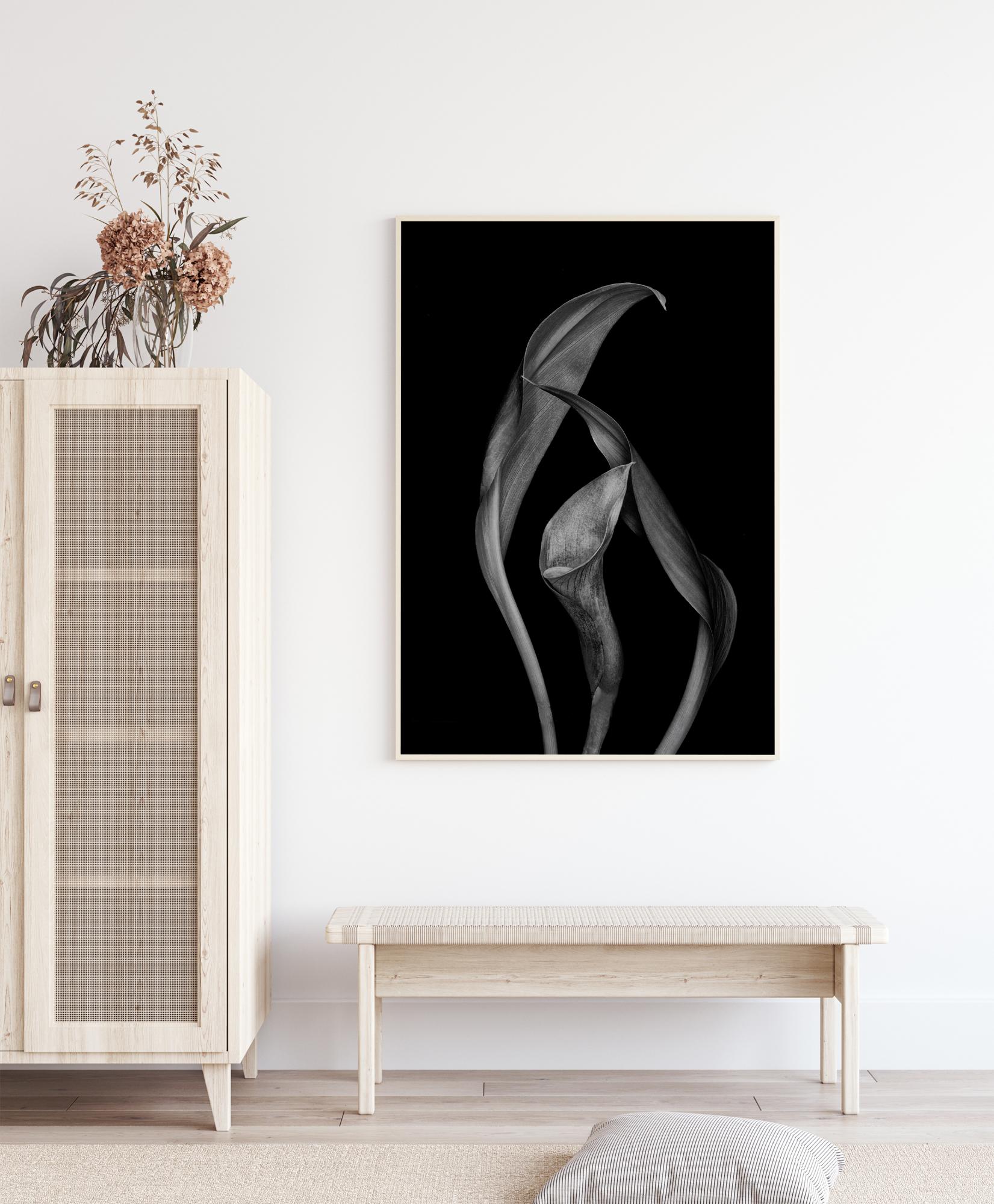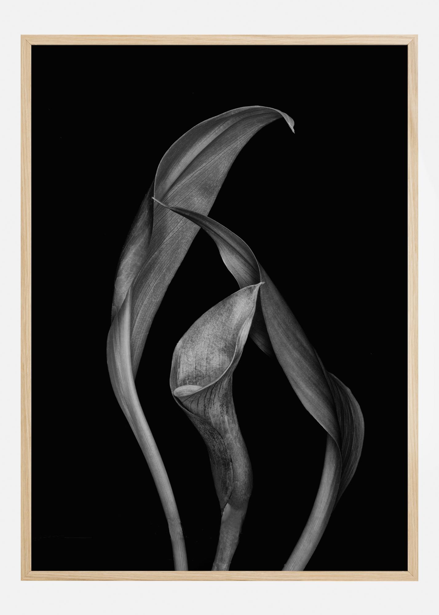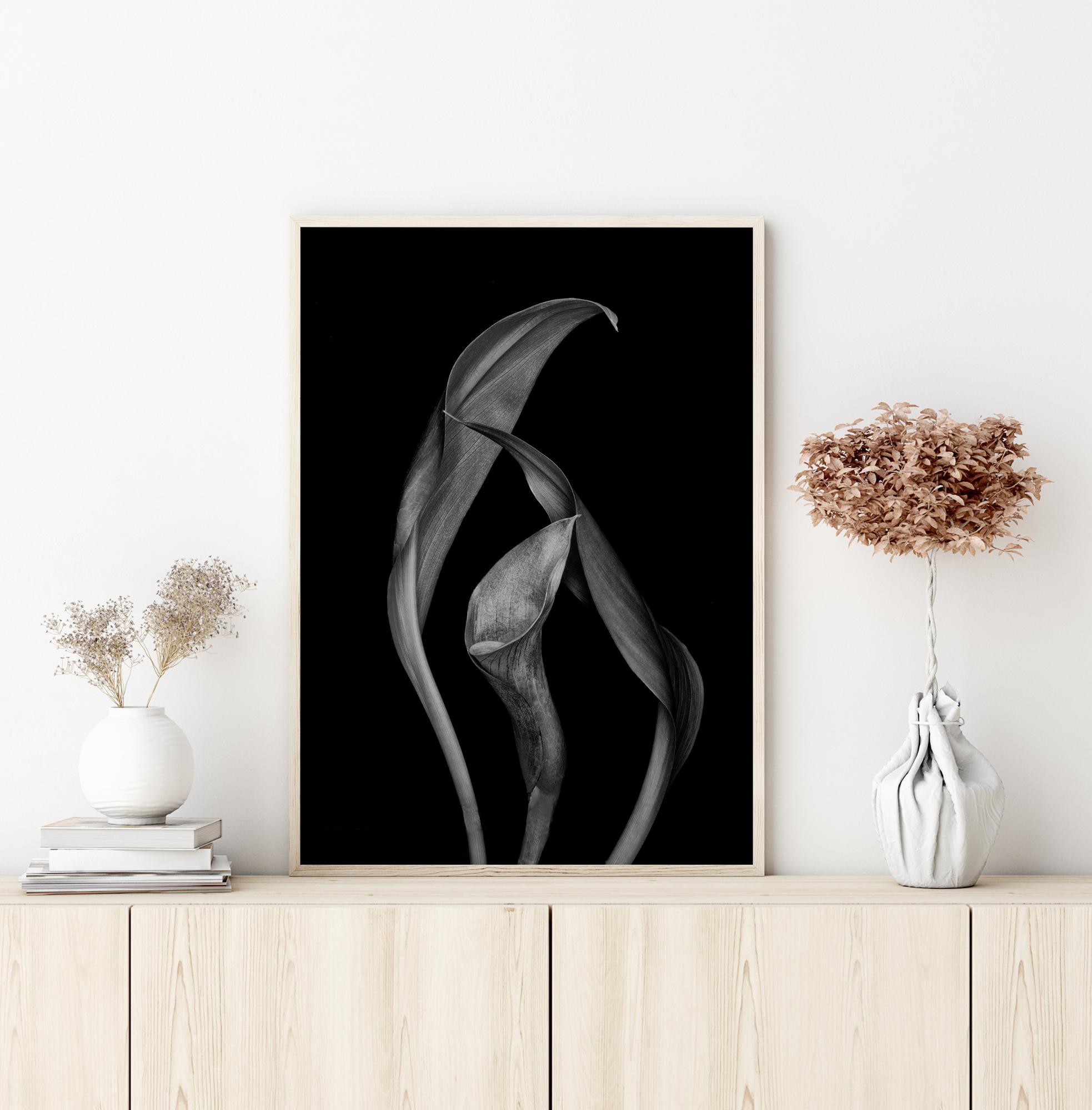 Une affiche inhabituelle de lys Calla dansants sur un fond noir. Ajoutez une touche dramatique à votre intérieur avec cette photo de nature étrange, mais envoutante, qui ne manquera pas d'inspirer ceux qui la verront.