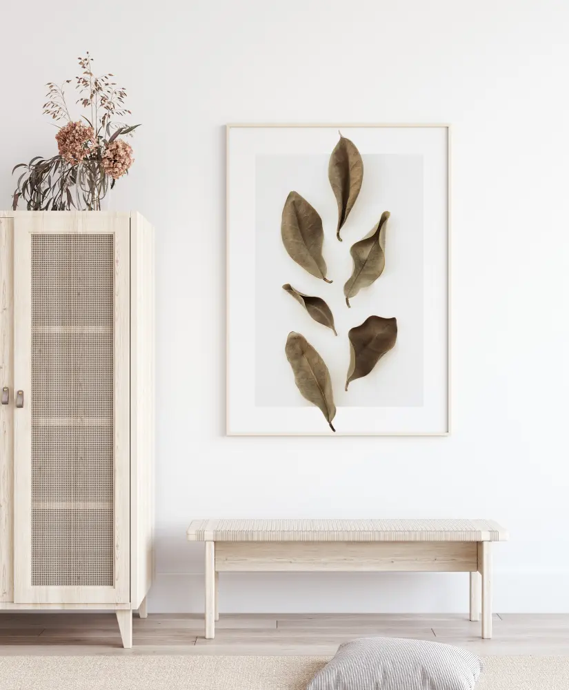 Une affiche détaillée de quelques feuilles séchées. Six feuilles séchées sont disposées comme si elles étaient encore attachées à une branche sur un fond blanc. Les feuilles brunes sont simples et unies, parfaites pour mettre en valeur un mur chargé ou ajouter un motif à un mur monochrome.