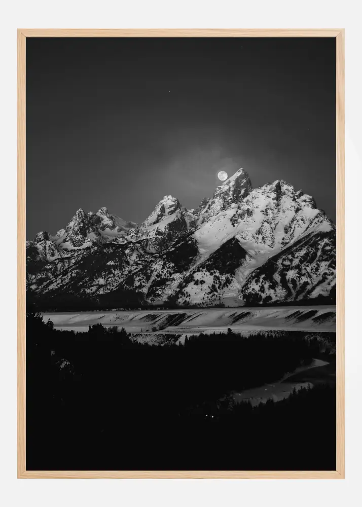 Une affiche de paysage spectaculaire avec de hautes montagnes enneigées sur un ciel sombre et omniprésent. Les sommets d'un blanc éclatant de la chaîne des Teton se détachent d'un fond noir, brillant de neige blanche. Une lueur de lune éclaire encore plus la neige. Ajoutez cette image à un mur blanc pour une touche spectaculaire et sombre.