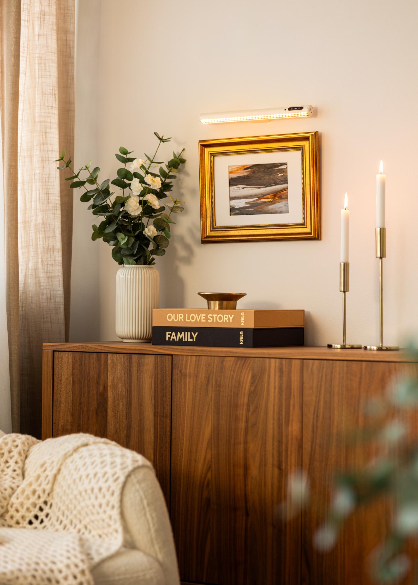 KAILA Illuminate est un éclairage de tableau élégant et alimenté par batterie avec une finition blanche, parfait pour mettre en valeur vos tableaux sans câbles gênants. Le design sans fil rend l'installation simple et flexible, sans avoir à penser aux prises électriques. La couleur blanche élégante offre une expression moderne et discrète qui s'intègre dans différents styles d'intérieur, tandis que la lumière uniforme met en valeur les détails et les couleurs de votre art. Facile à installer et à utiliser – une solution pratique et harmonieuse pour vos œuvres murales.