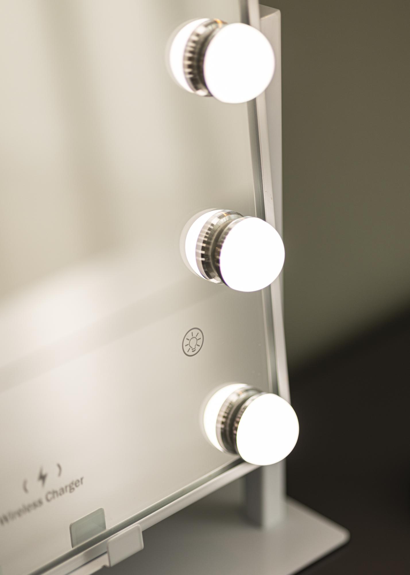 Voici un joli miroir à maquillage avec un détail particulièrement luxueux – à savoir, il prend en charge le chargement sans fil de votre smartphone ! Lorsque la lampe est allumée, placez votre appareil à l'endroit désigné sur le miroir, pour le charger avec 5V2A (10W). C'est très pratique lors des matinées chargées où vous désirez garder votre portable à proximité tout en vous préparant devant le miroir. Cette fonctionnalité marche pour tous les modèles de smartphones pouvant être rechargé sans fil.
