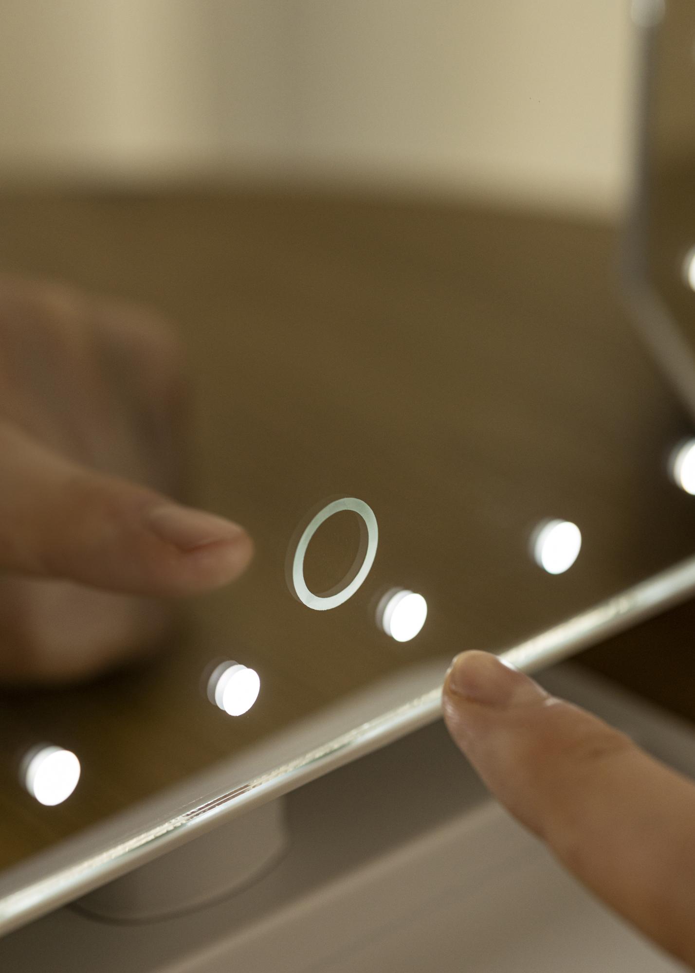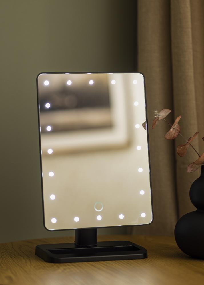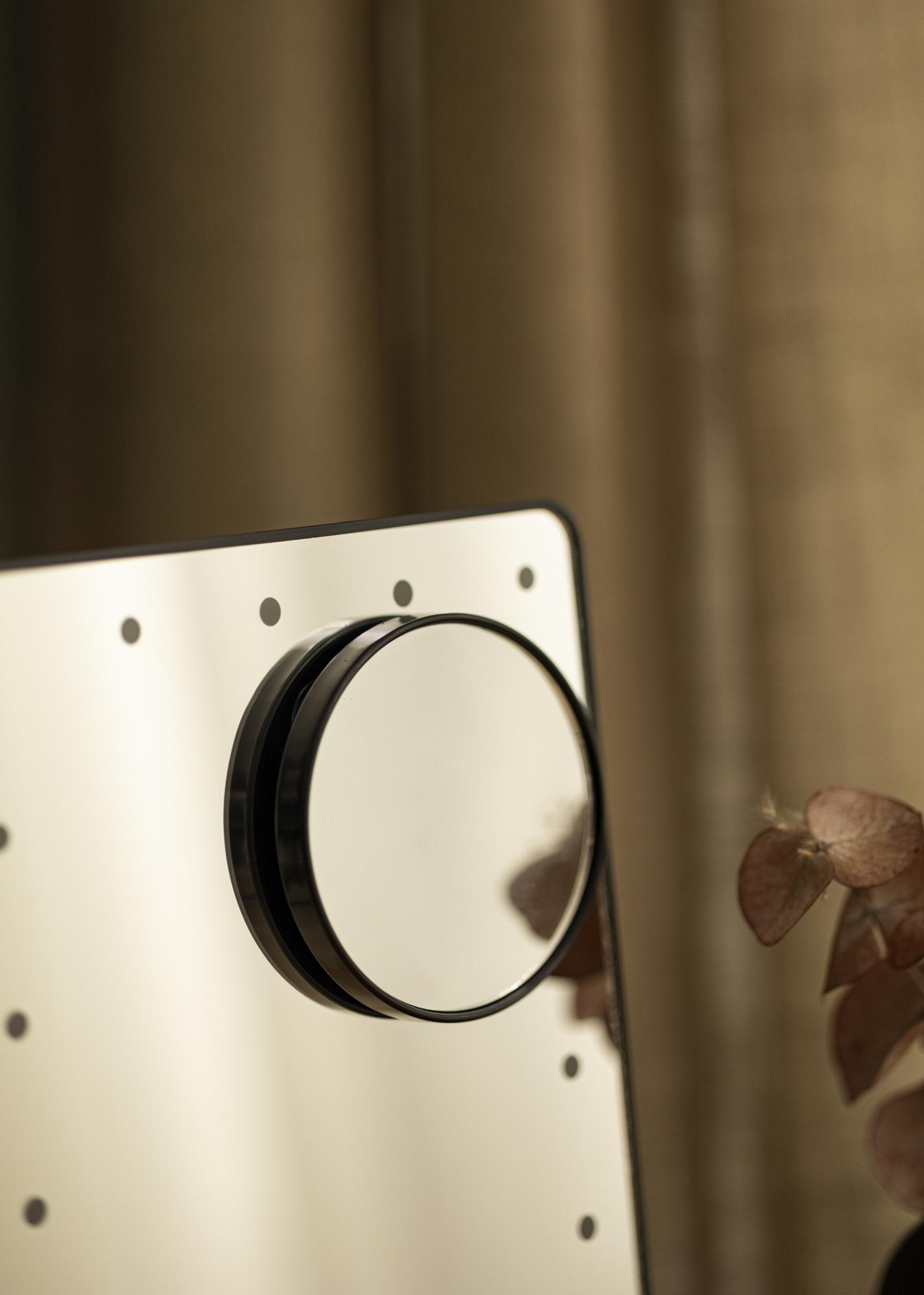 Le miroir a un design intelligent avec un éclairage LED à intensité variable qui fournit une lumière blanche froide. Vous allumez et éteignez l'éclairage avec le bouton situé à l'arrière. Afin de pouvoir vous reflétez correctement, ce miroir de maquillage est également rotatif et peut être incliné, de sorte que vous pouvez ajuster la position de la surface du miroir selon vos souhaits. Il est livré avec un miroir plus petit grossissant x2 et x3, qui peut être facilement se fixer au verre du miroir principal. Le miroir a une batterie lithium intégrée qui se recharge via une connexion USB. Câble de recharge inclus.