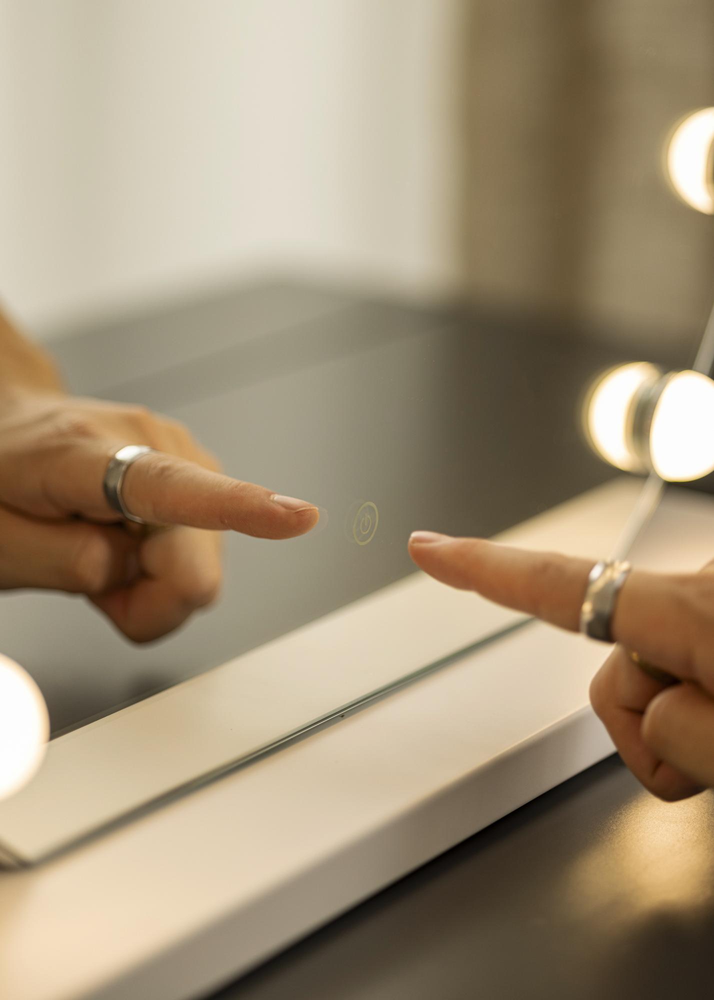 Un miroir de maquillage élégant et luxueux dans une teinte blanche esthétique qui dégage une forte atmosphère hollywoodienne ! Le miroir de maquillage a 12 ampoules LED décoratives qui donnent une lueur blanche uniforme et chaude en 3000K - parfait pour appliquer le maquillage ! L'éclairage s'allume en appuyant sur le bouton tactile et se règle facilement en maintenant le bouton enfoncé pendant quelques secondes. L'éclairage LED est une source lumineuse économe en énergie qui fournit une lueur naturelle.