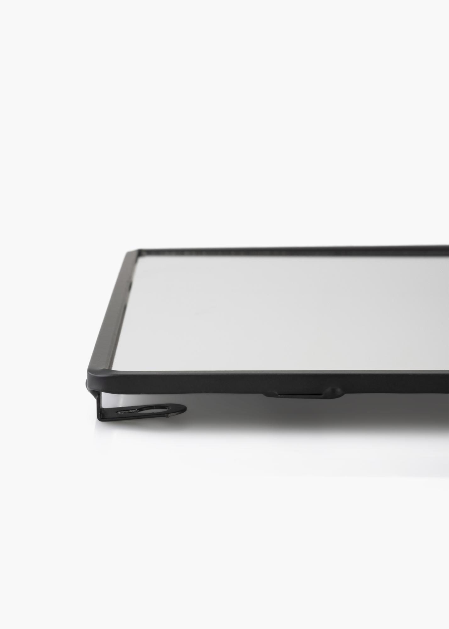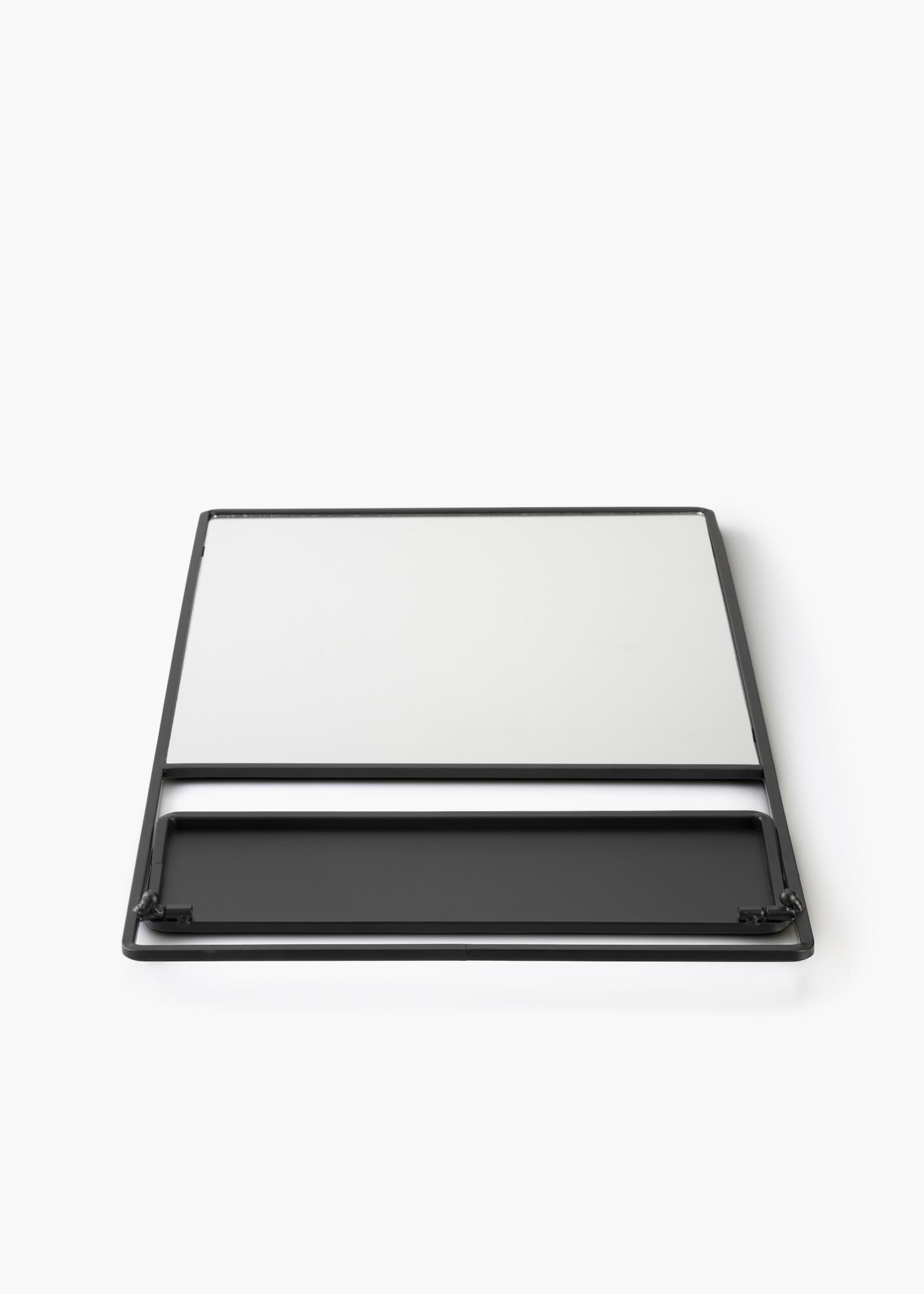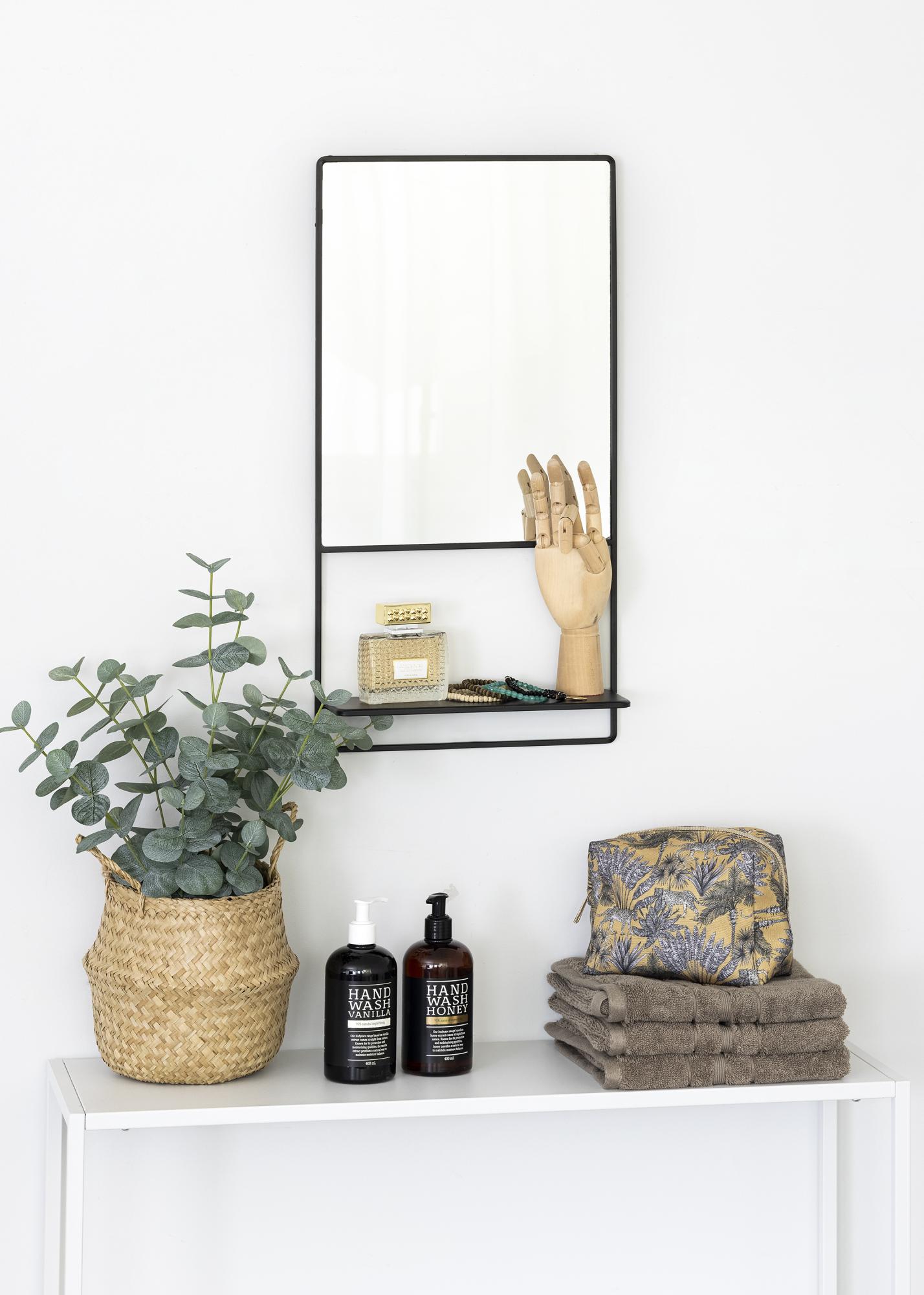 Ce miroir mural esthétique avec étagère est de conception nordique par KAILA. Le miroir se présente dans une teinte noire et il est conçu en métal. La surface du miroir même se présente dans une forme rectangulaire et est encadrée par un bord en métal noir. Sa partie inférieure est dotée d'une étagère - idéal pour y déposer une jolie décoration ou comme petit rangement pour le maquillage ! Le miroir mesure 31x60 cm et dispose de supports muraux.