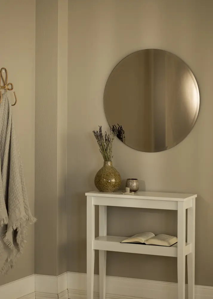 Un miroir dans une teinte bronze assez sombre deviendra une élément exclusif dans votre foyer. Ce miroir mural a une forme ronde douce et un élégant verre miroir dans une teinte couleur bronze. Ce luxueux ensemble est couronné par le bord à facettes. Le miroir fonctionne aussi bien accroché seul qu'avec d'autres miroirs de différentes tailles et nuances de couleurs.