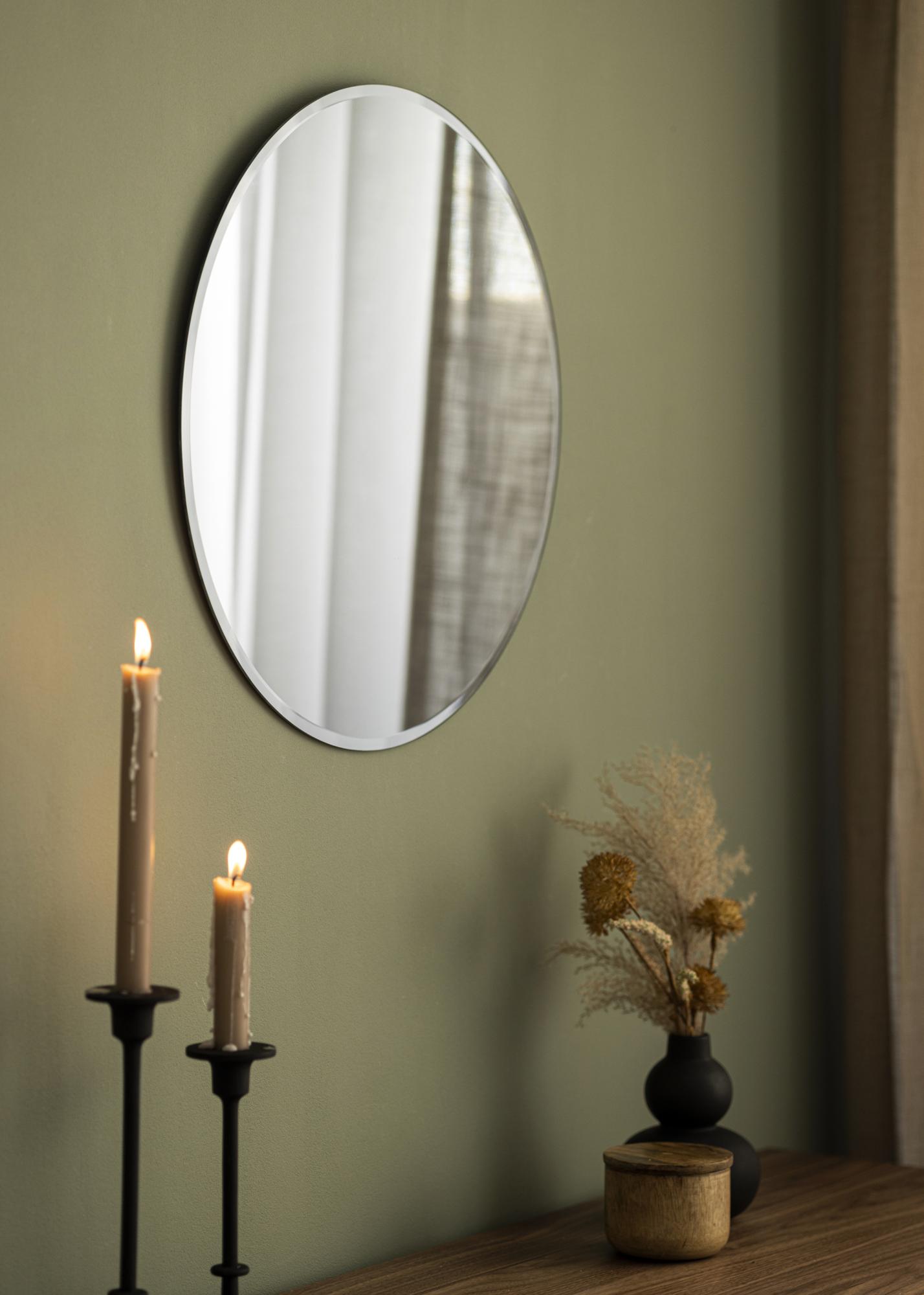 Le sentiment d'élégance que la forme et la couleur du miroir transmettent est renforcé par le fait que le miroir soit dépourvu de cadre. Au lieu de cela, les extrémités sont ornées d'un bord facetté soigné, ce qui donne au miroir ce petit plus.