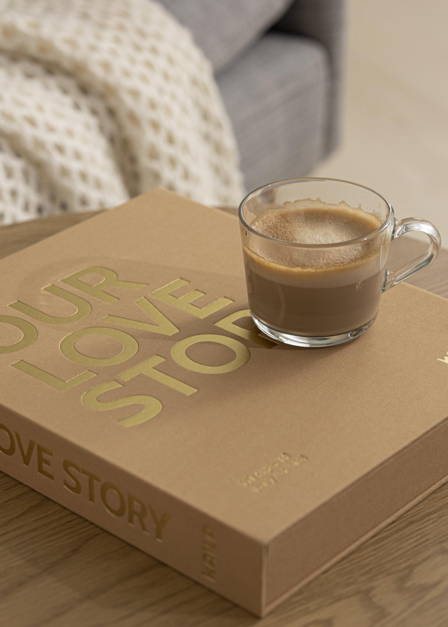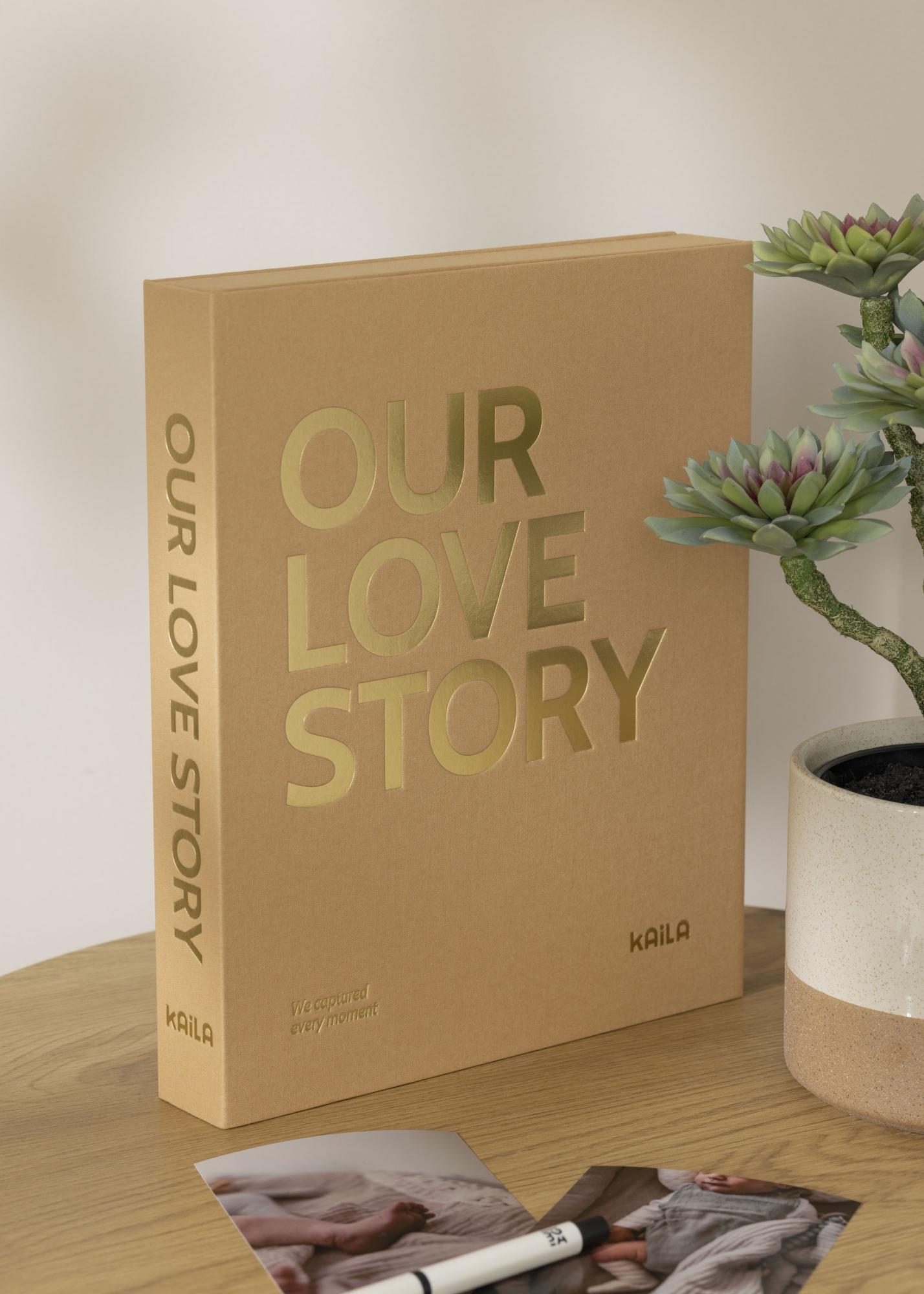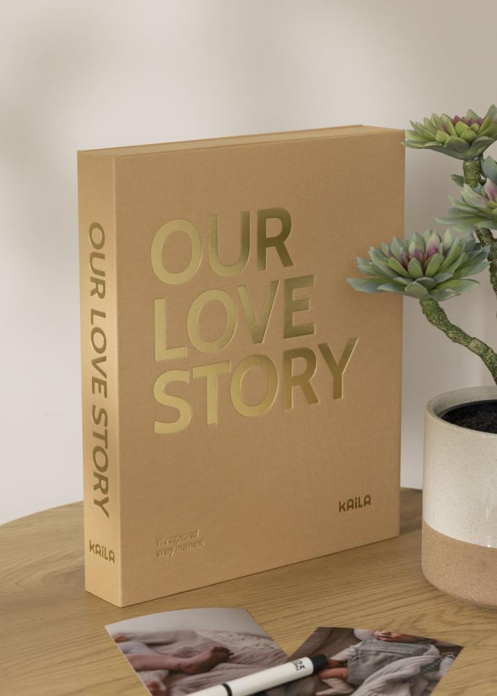 Voici un album photo et un Coffe table book (livre de chevet) combinés en un seul qui se transforme en même temps en un détail d'intérieur décoratif pour votre foyer. L'album photo est conçu comme une boîte recouverte de textile et se présente dans une jolie teinte manille. Sur le devant de l'album photo, il y a le titre ”OUR LOVE STORY” imprimé en lettres capitales dorées et le sous-titre ”We captured every moment” qui rend cet album parfait pour conserver de beaux souvenirs des personnes qui vous sont les plus chères, ou bien pour offrir en cadeau. Pourquoi ne pas conserver de belles photos de mariage dans cet élégant album photo ? À l'intérieur de l'album photo vous trouverez un motif imprimé discret et un classeur à anneaux avec 30 feuilles (60 pages) noires où vous collez vous-même vos photos, ce qui vous offre la possibilité d'être créatif.